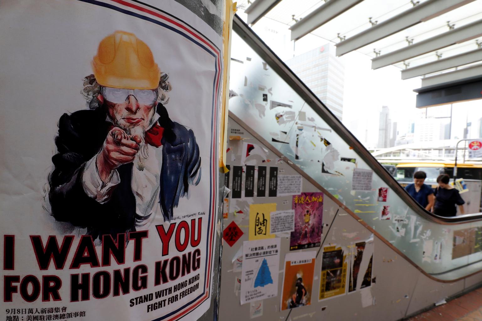 Posters and sticker notes supporting the anti-government protest movement are seen near the Central Government Offices in Hong Kong, on Sept 5, 2019.