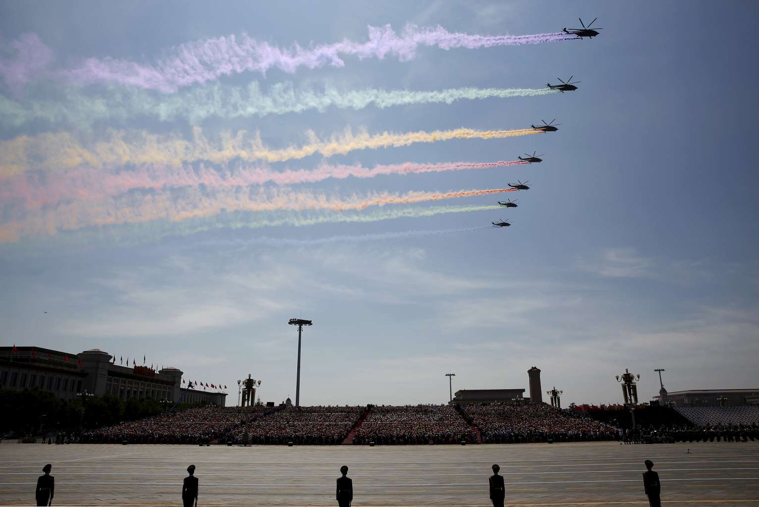 Military helicopters flying in formation over Chinese soldiers on Tiananmen Square during the military parade marking the 70th anniversary of the end of World War II, in Beijing, China, on Sept 3, 2015.