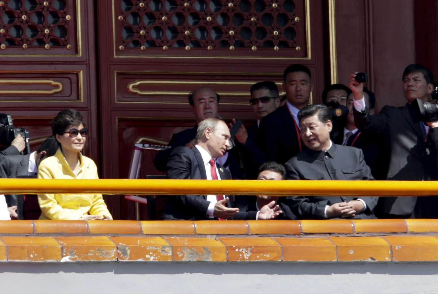 Russian President Vladimir Putin (centre) chats with China's President Xi Jinping (right) next to South Korea's President Park Geun Hye on Tiananmen Gate during the military parade marking the 70th anniversary of the end of World War II, in Beijing, China, on Sept 3, 2015.