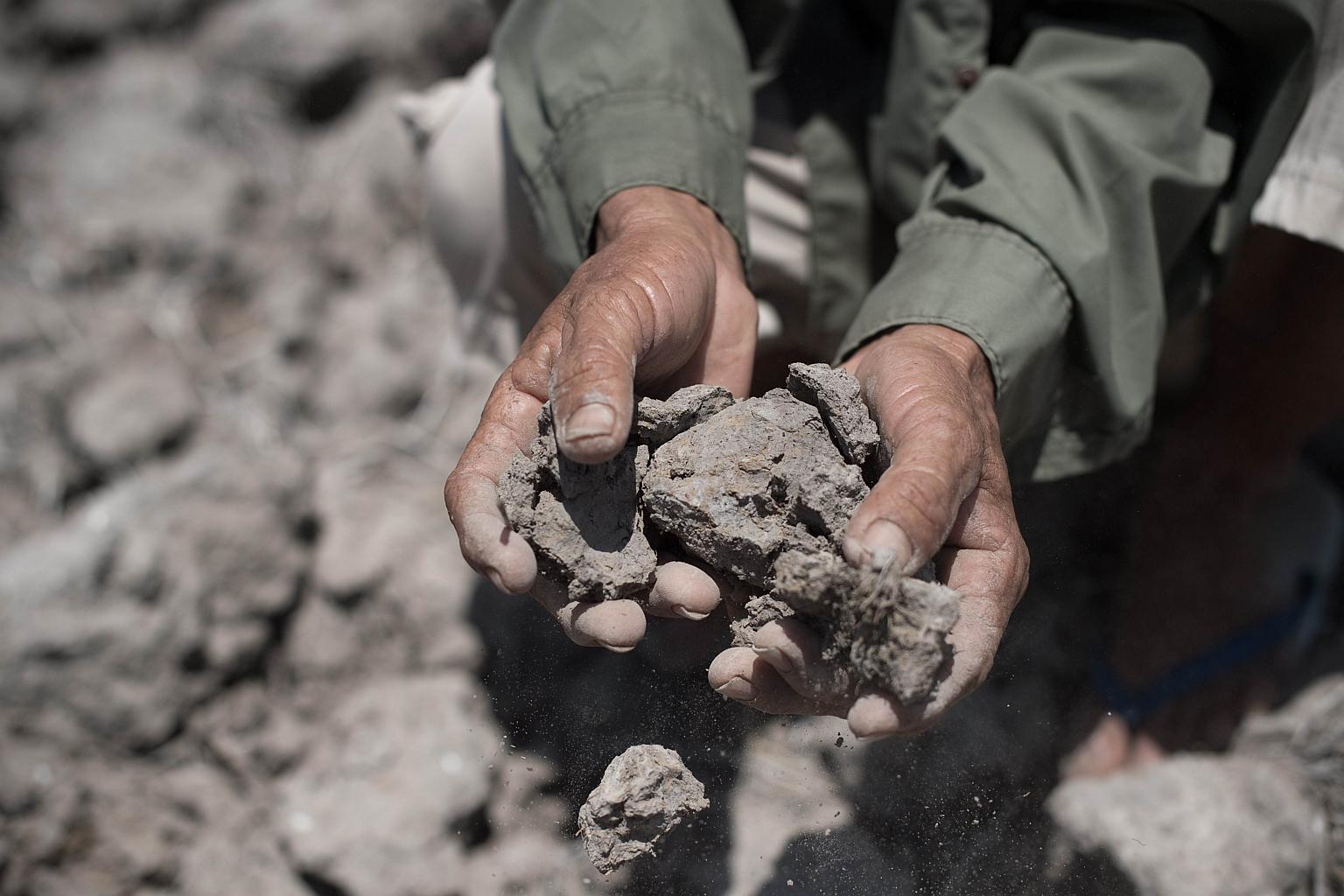 A Thai farmer showing the dried soil from his field which usually yields a crop, in Bang Pla Ma district, Suphanburi province.