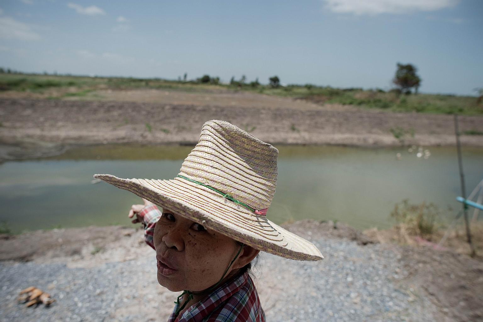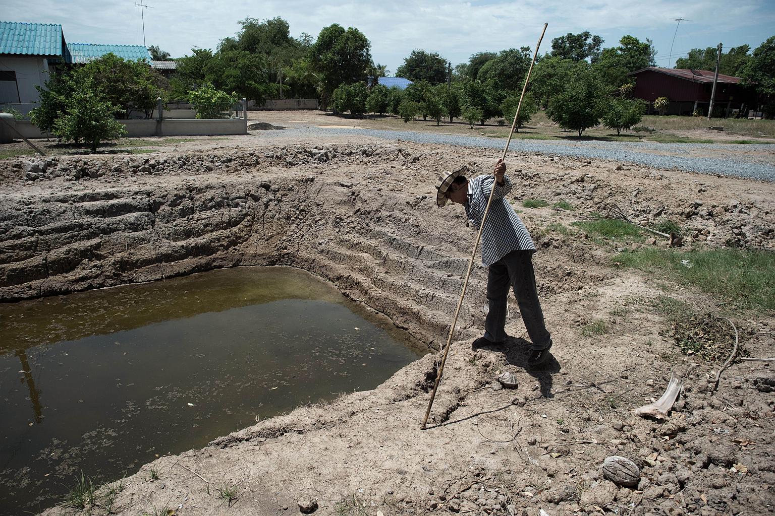A Thai farmer looking at a nearly dried out farm pond, which is usually full, in Bang Pla Ma district, Suphanburi province.