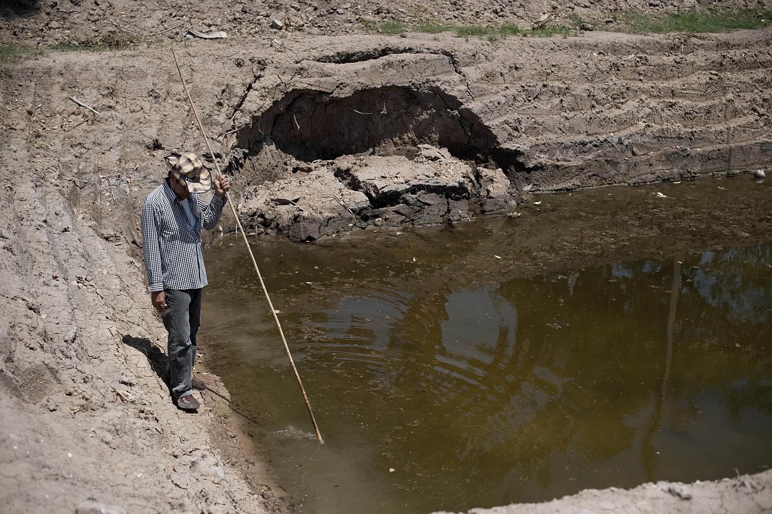 A Thai farmer looking at a nearly dried out farm pond, which is normally full, in Bang Pla Ma district, Suphanburi province.