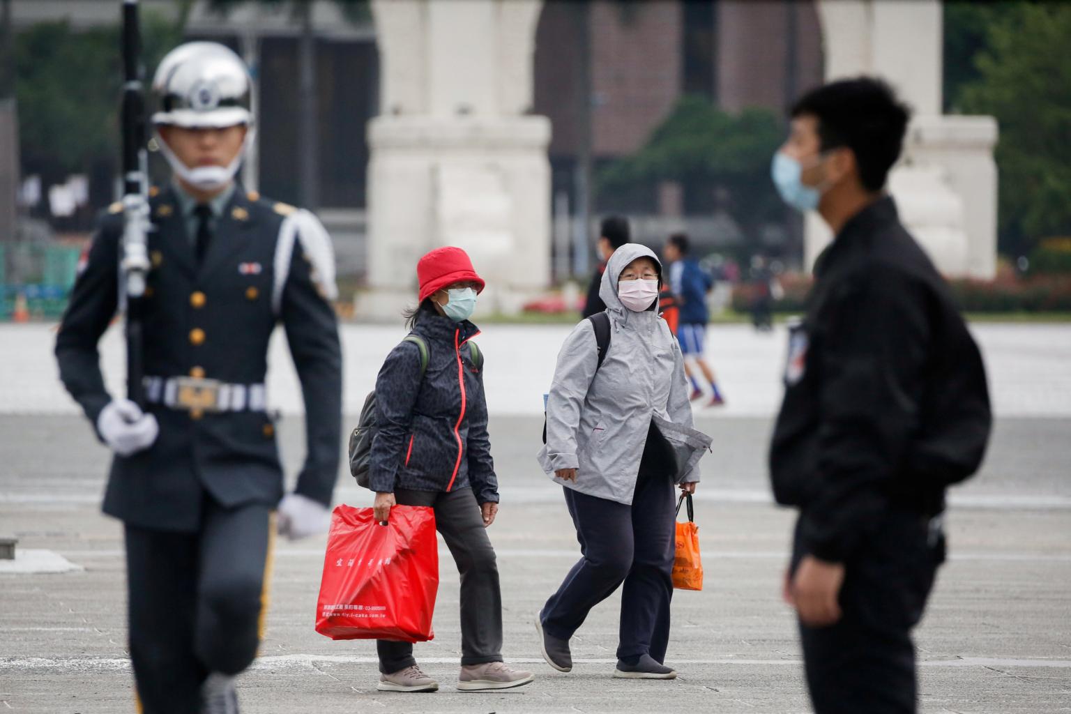 Tourists wearing face masks at the Chiang Kai Shek Memorial Hall in Taipei on March 11, 2020.