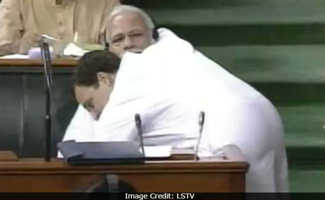 Gandhi interrupted a no-confidence debate by walking across the parliament floor to give his rival a hug.