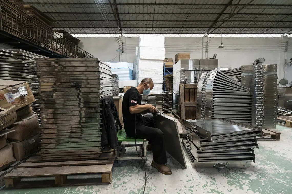 A worker in a small factory making restaurant appliances in Guangzhou, China, on April 9, 2025.