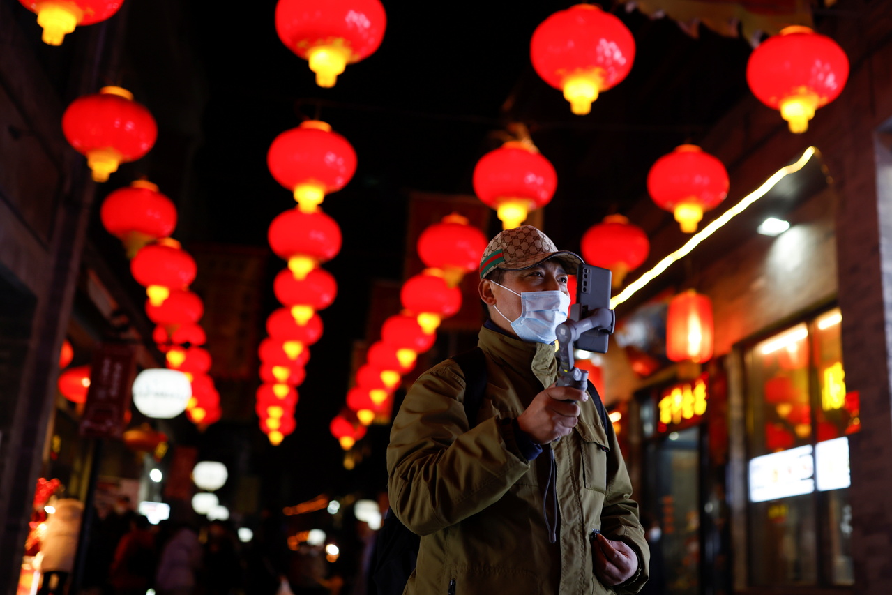 A man uses his phone while walking near Qianmen street in Beijing on Feb10, 2021.