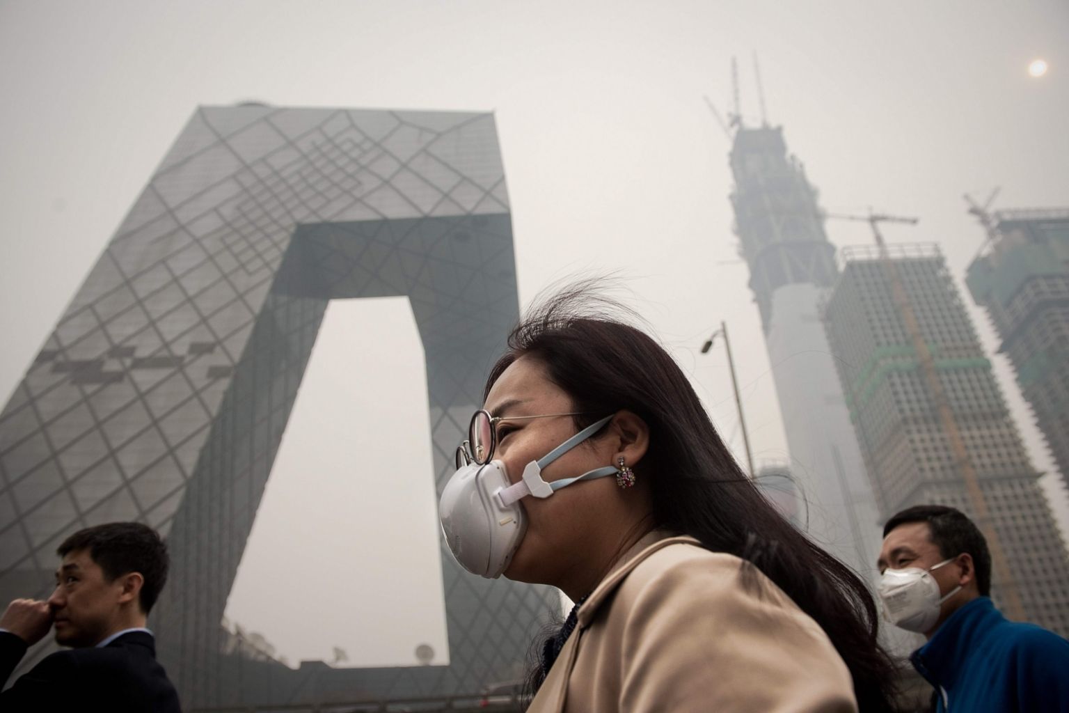 A woman wearing a protective pollution mask while walking on a street in Beijing, China.