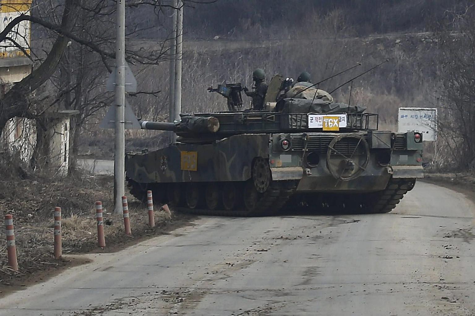 A South Korean K-1 tank moves near the western section of the inter-Korean border in Paju.