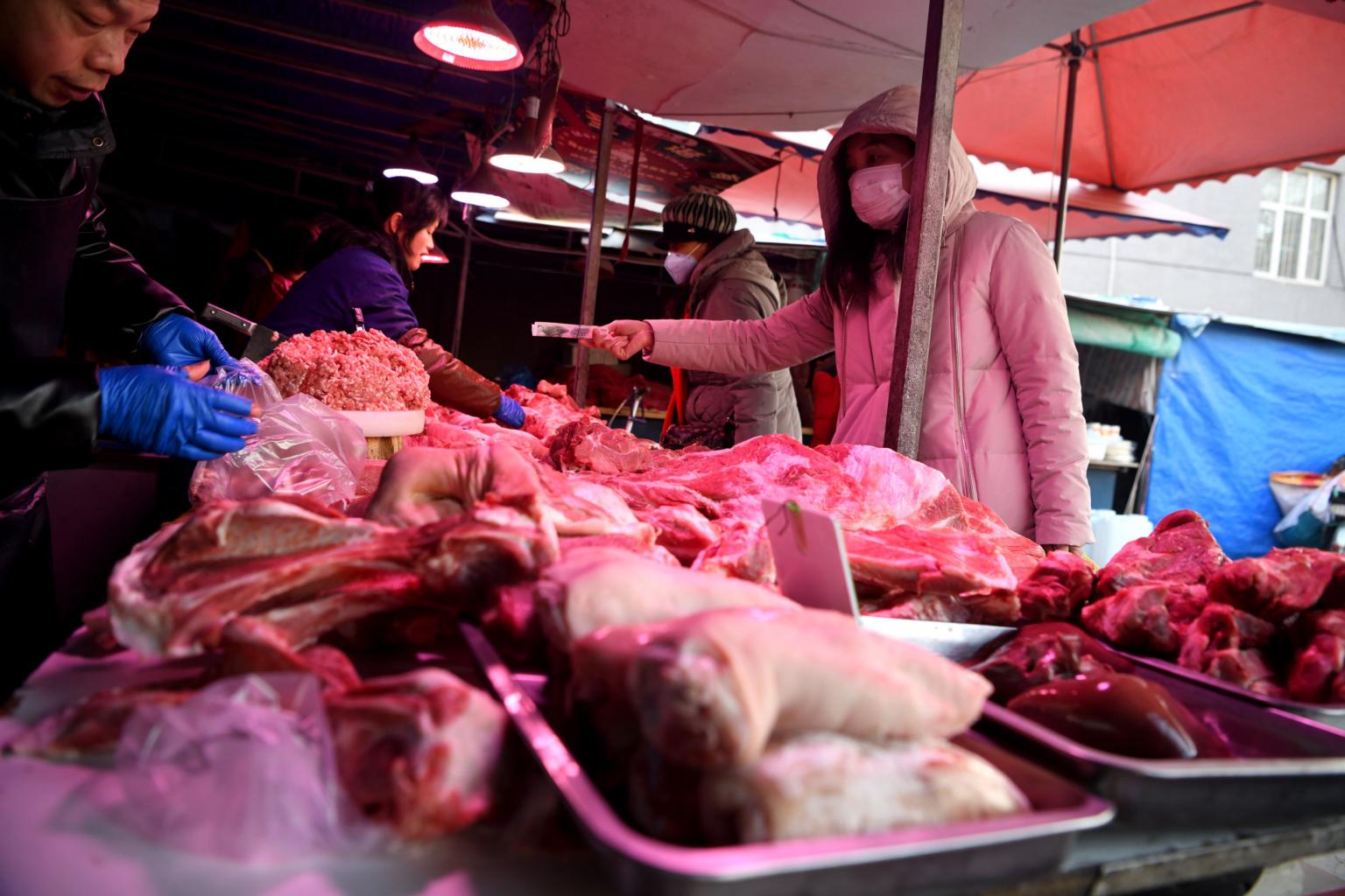 Customers wearing protective masks buying meat at a market in Beijing, China, on Jan 23, 2020.