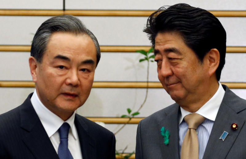 Chinese government's top diplomat, State Councillor Wang Yi meets with Japan's Prime Minister Shinzo Abe at Abe's official residence in Tokyo, Japan, on April 16, 2018.