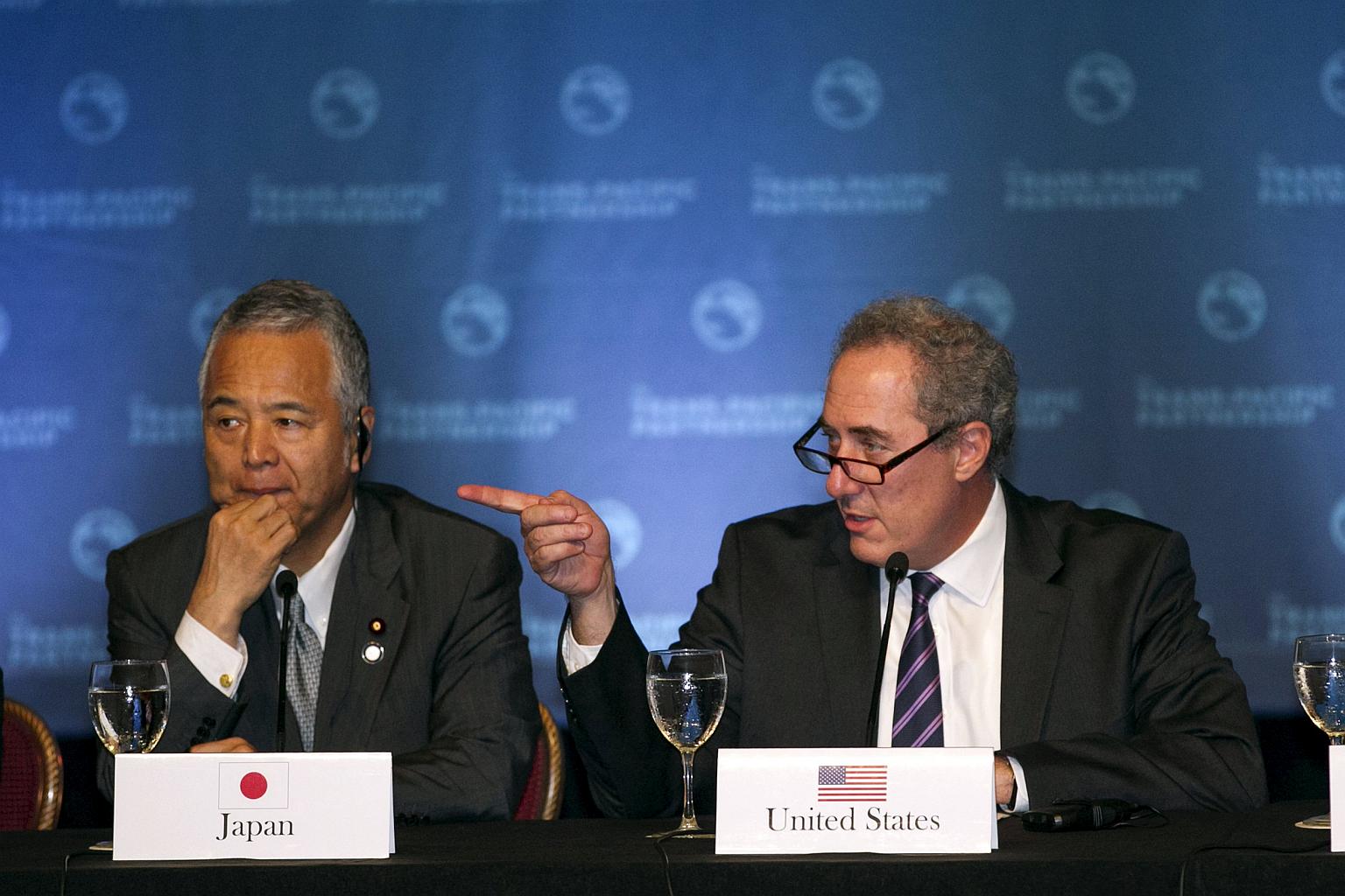 Japanese Economy Minister Akira Amari and US Trade Rep. Michael Fromam participate in a press conference in Lahaina, Maui, Hawaii.