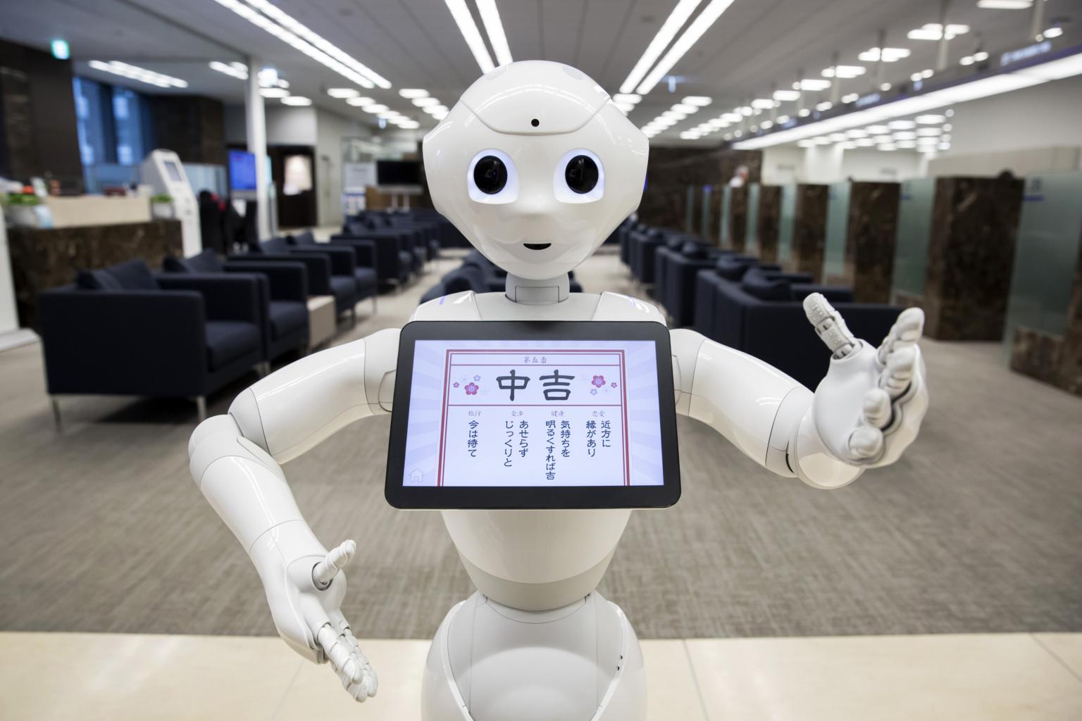 A Pepper humanoid robot, developed by SoftBank Group Corp., stands inside the Mizuho Financial Group Inc. headquarters in Tokyo, Japan.