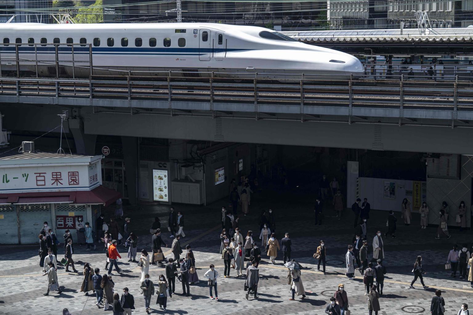 A Shinkansen arrives in Tokyo on April 10, 2021.