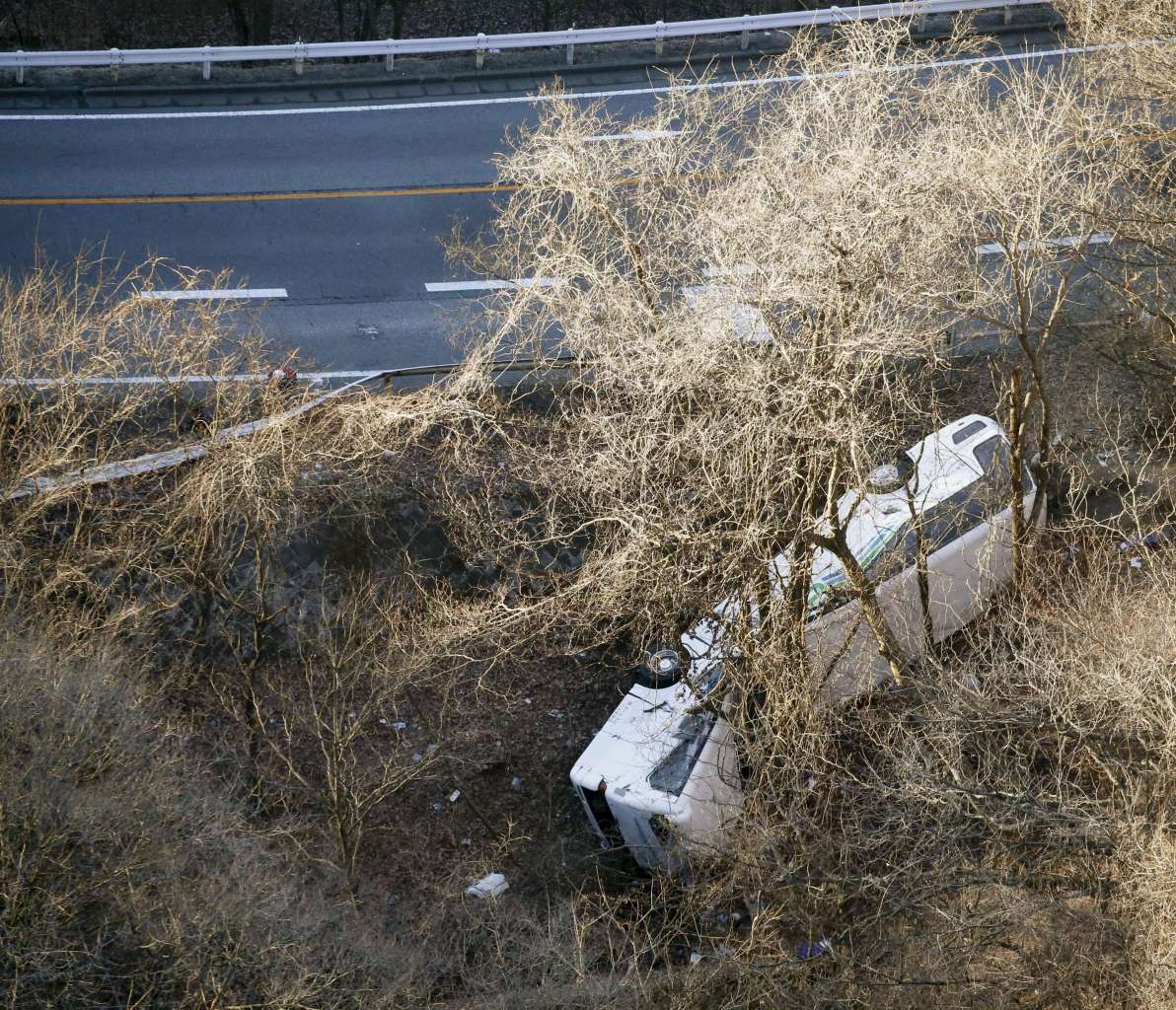 The tour bus that veered off a road is seen after it crashed in Karuizawa, Nagano prefecture, Japan, on Jan 15, 2016.
