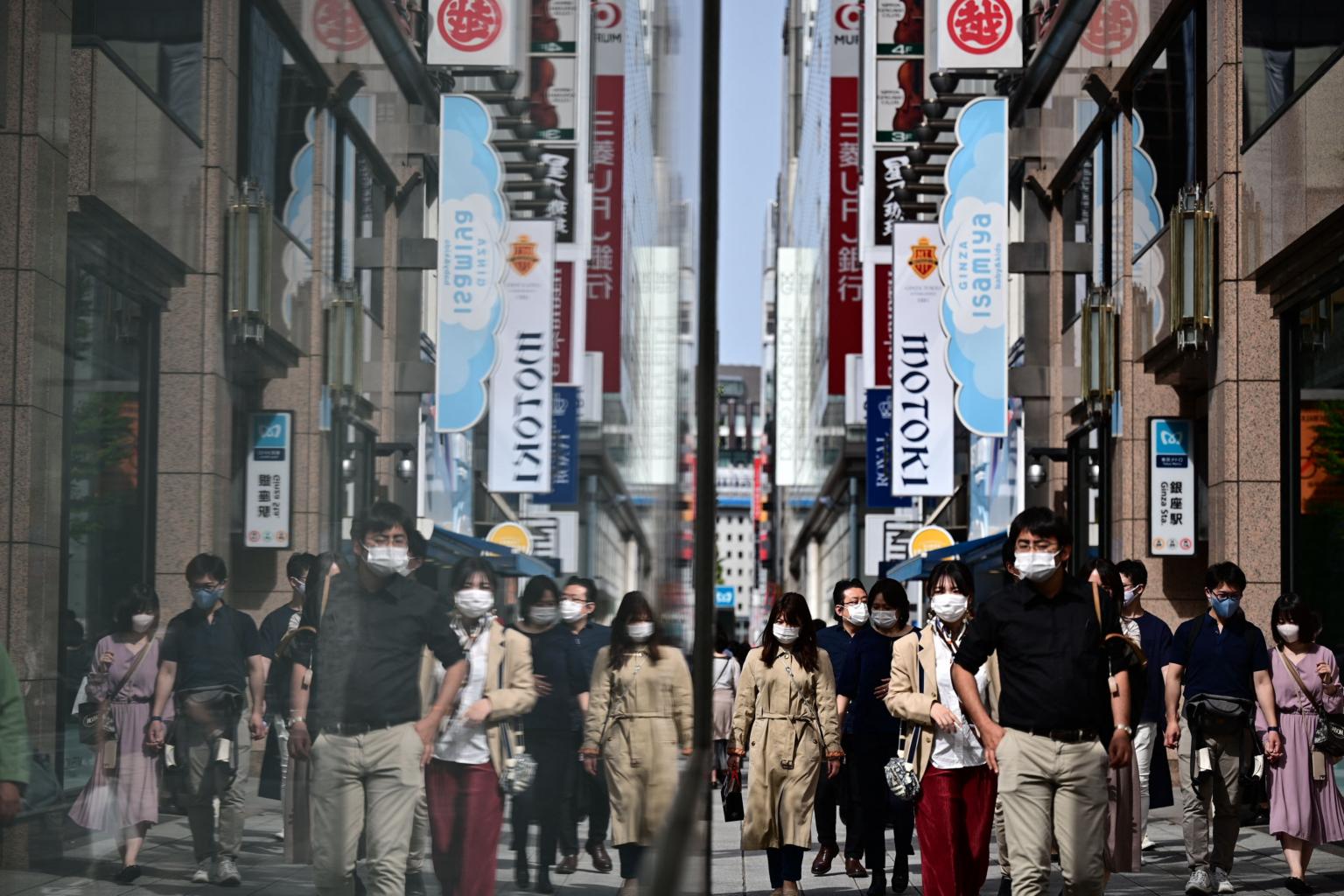 People walk along a street in the Ginza district in Tokyo on May 4, 2021.