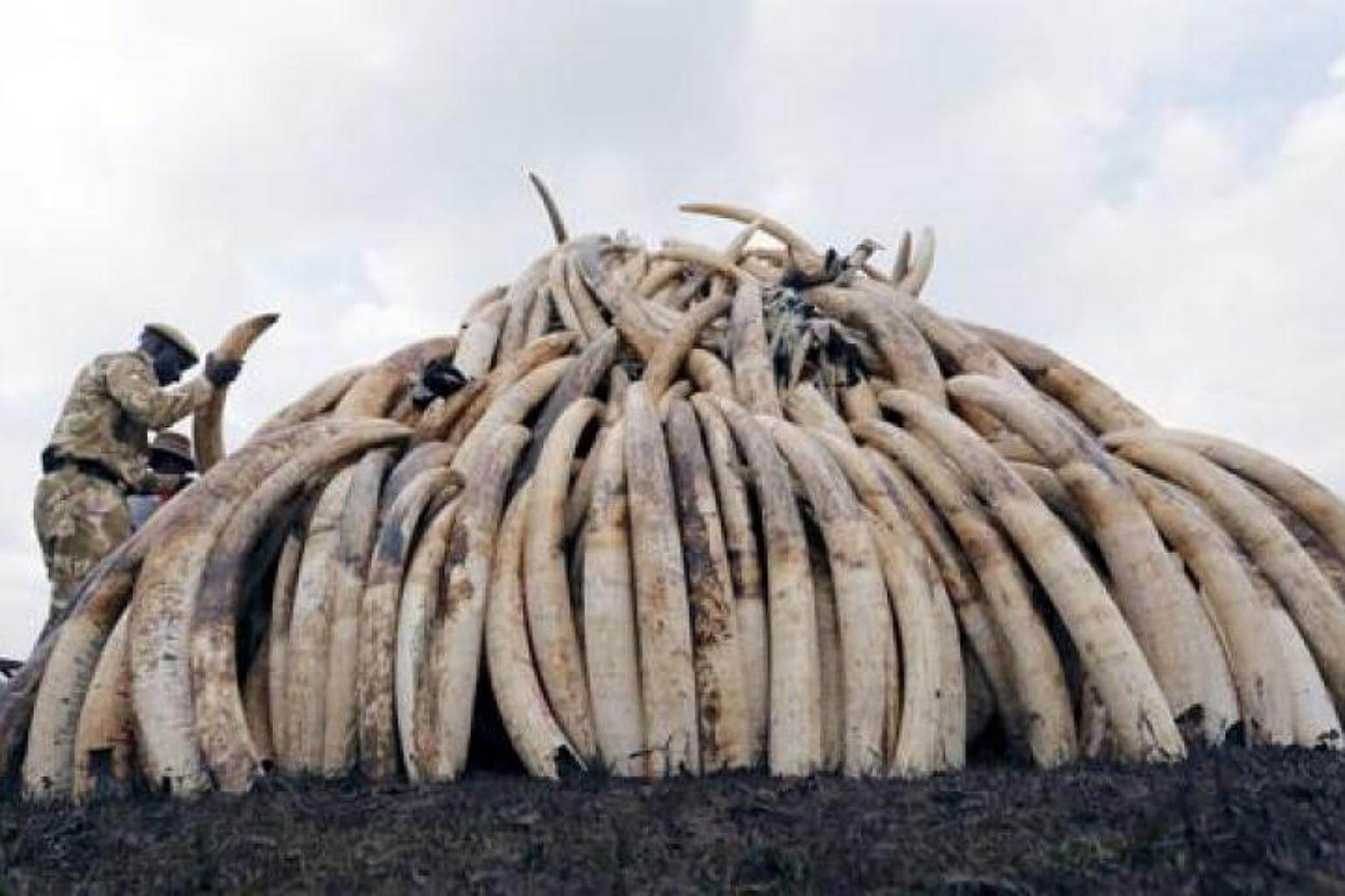 A Kenya Wildlife Service (KWS) ranger stacks elephant tusks, part of an estimated 105 tonnes of confiscated ivory to be set ablaze, on a pyre at Nairobi National Park near Nairobi, Kenya, on April 20, 2016.