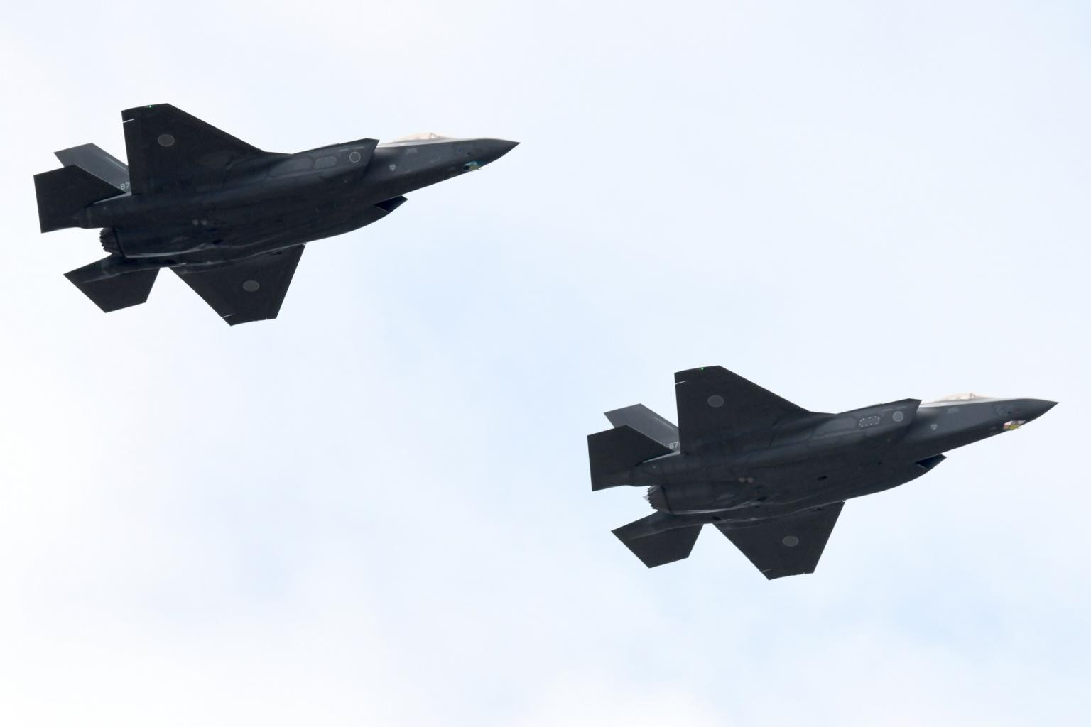 F-35A fighter aircraft from the Japan Air Self-Defence Force taking part in a military review at the Ground Self-Defence Force's Asaka training ground in Asaka, Saitama prefecture.