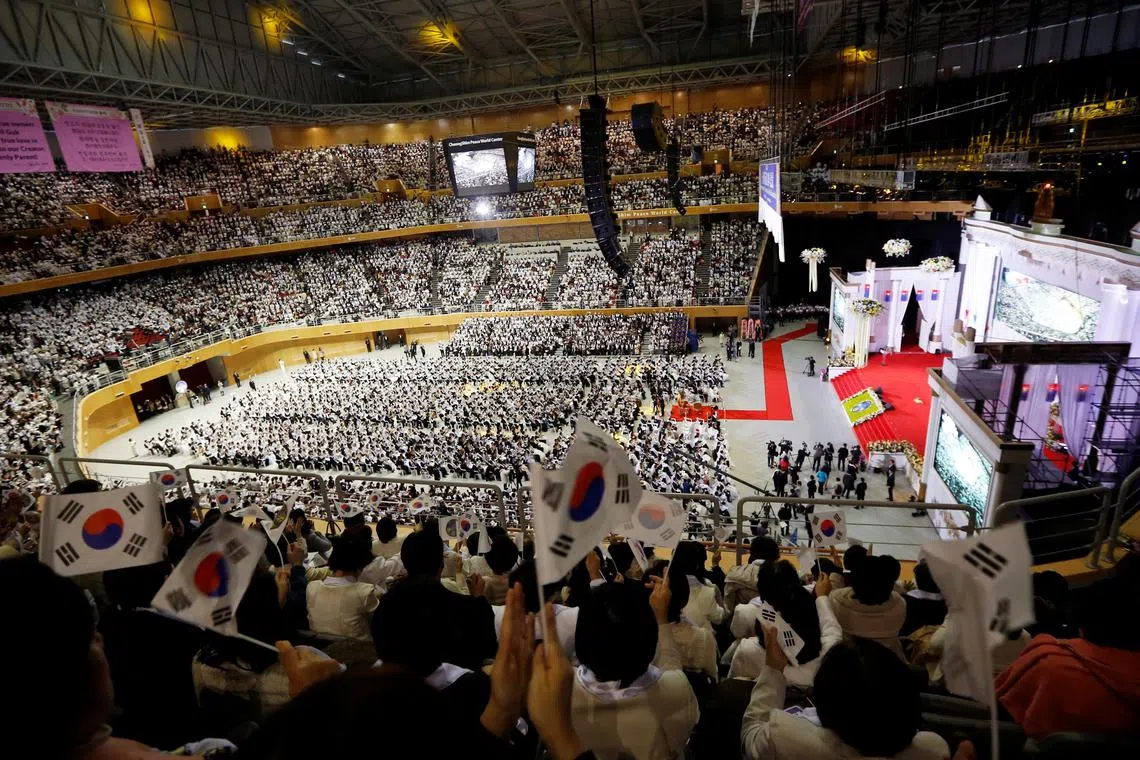 Thousands attend a mass wedding ceremony of the Unification Church at Cheongshim Peace World Centre in Gapyeong, South Korea in 2014.