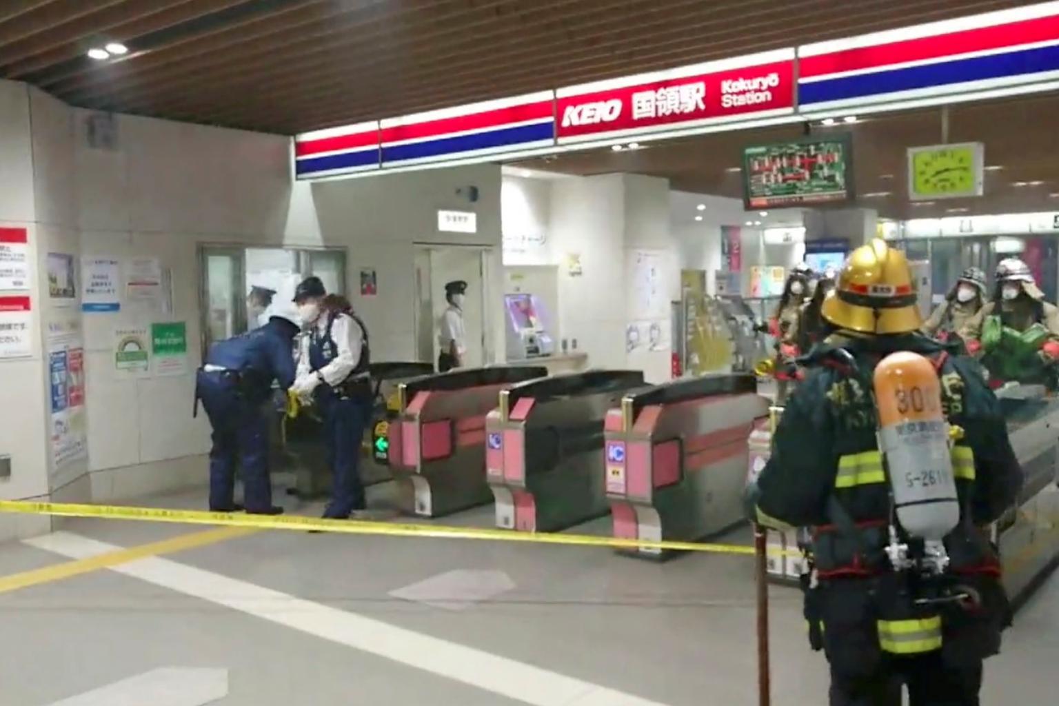 Firefighters and officers work at a Tokyo train station following a knife, arson and acid attack in Japan on Oct 31, 2021.