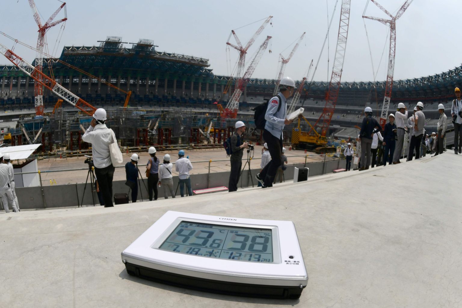 A digital thermometer showing the temperature going past 40 deg C, at the construction site for the new National Stadium in Tokyo on July 18, 2018.