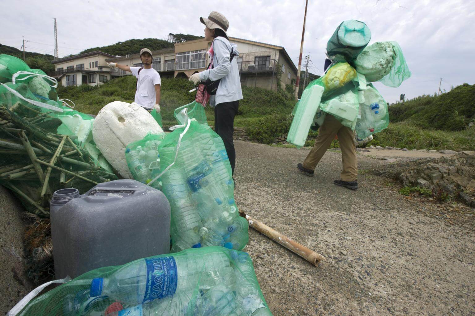 Volunteers clean up plastic from a beach on Oshima island, Japan, on Aug 26, 2017.