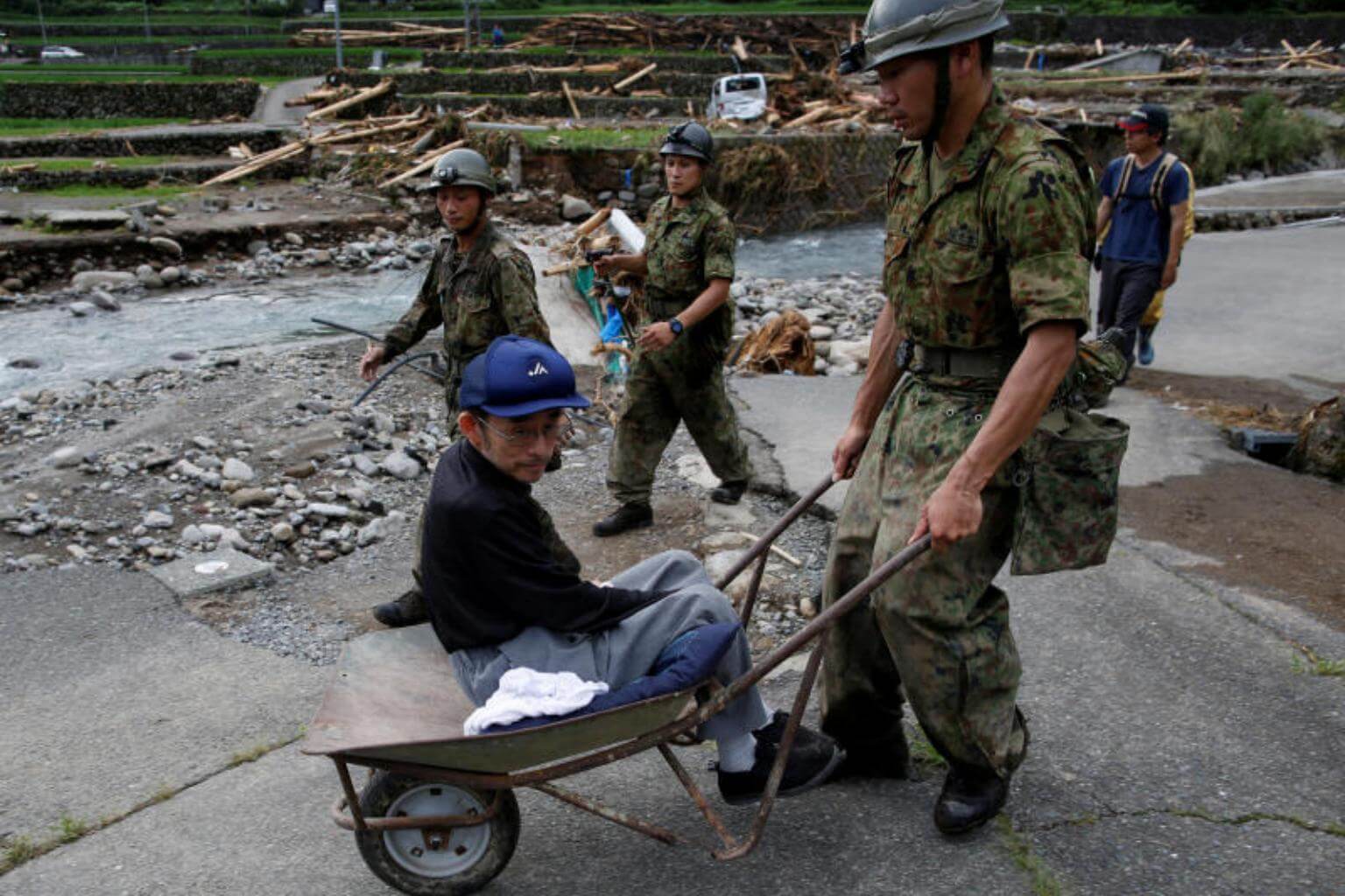 A local resident is aided by Japanese Self-Defense Force soldiers during the evacuation from an isolated area hit by heavy rain in Toho village, Fukuoka Prefecture, Japan on July 8, 2017.