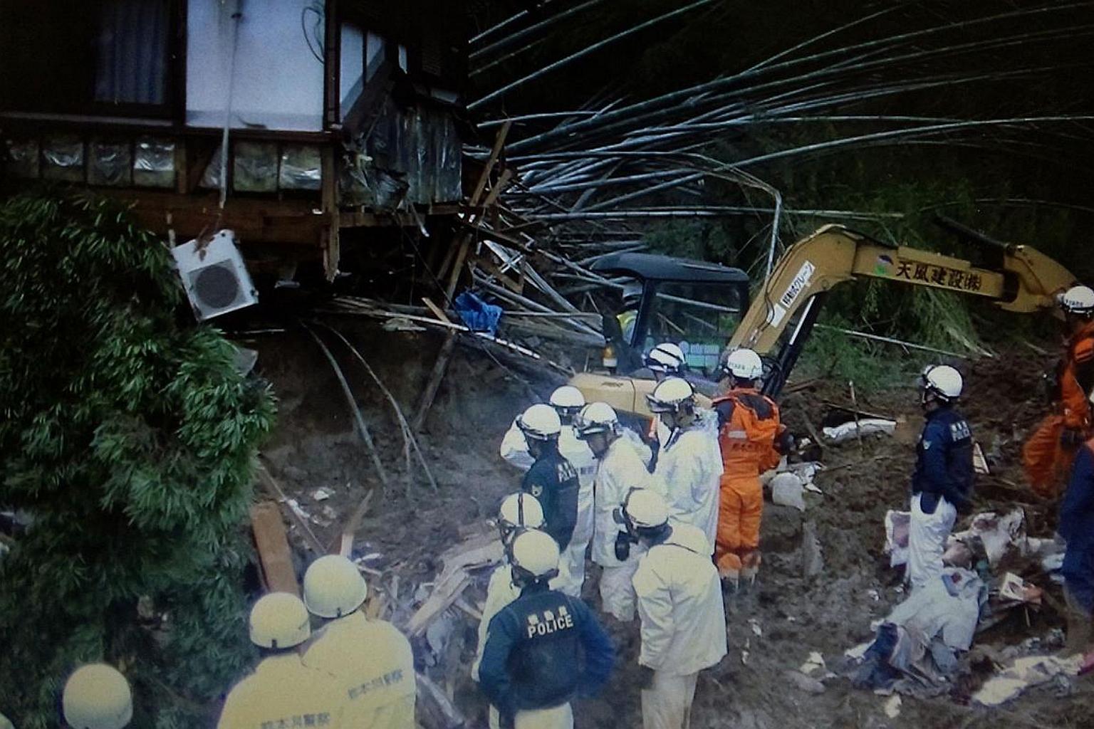 Police officers and firefighters during rescue operations following a landslide in the southern Japanese city of Kumamoto.