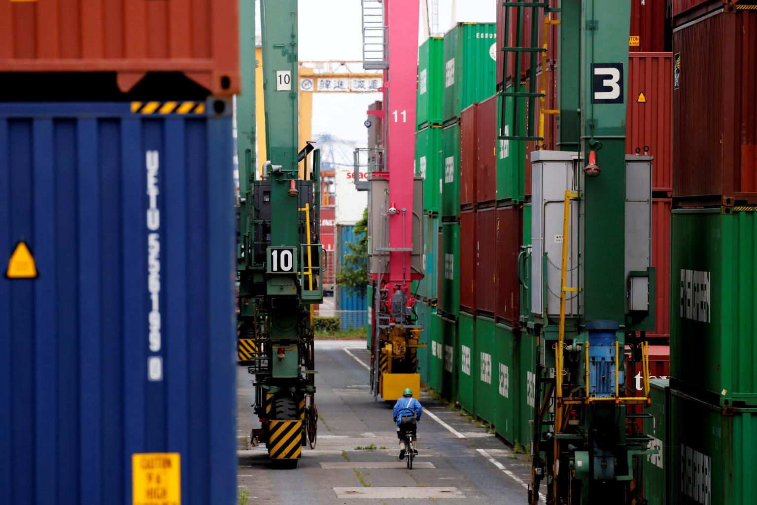A cyclist riding past containers at an industrial port in Tokyo, Japan, on May 22, 2019.