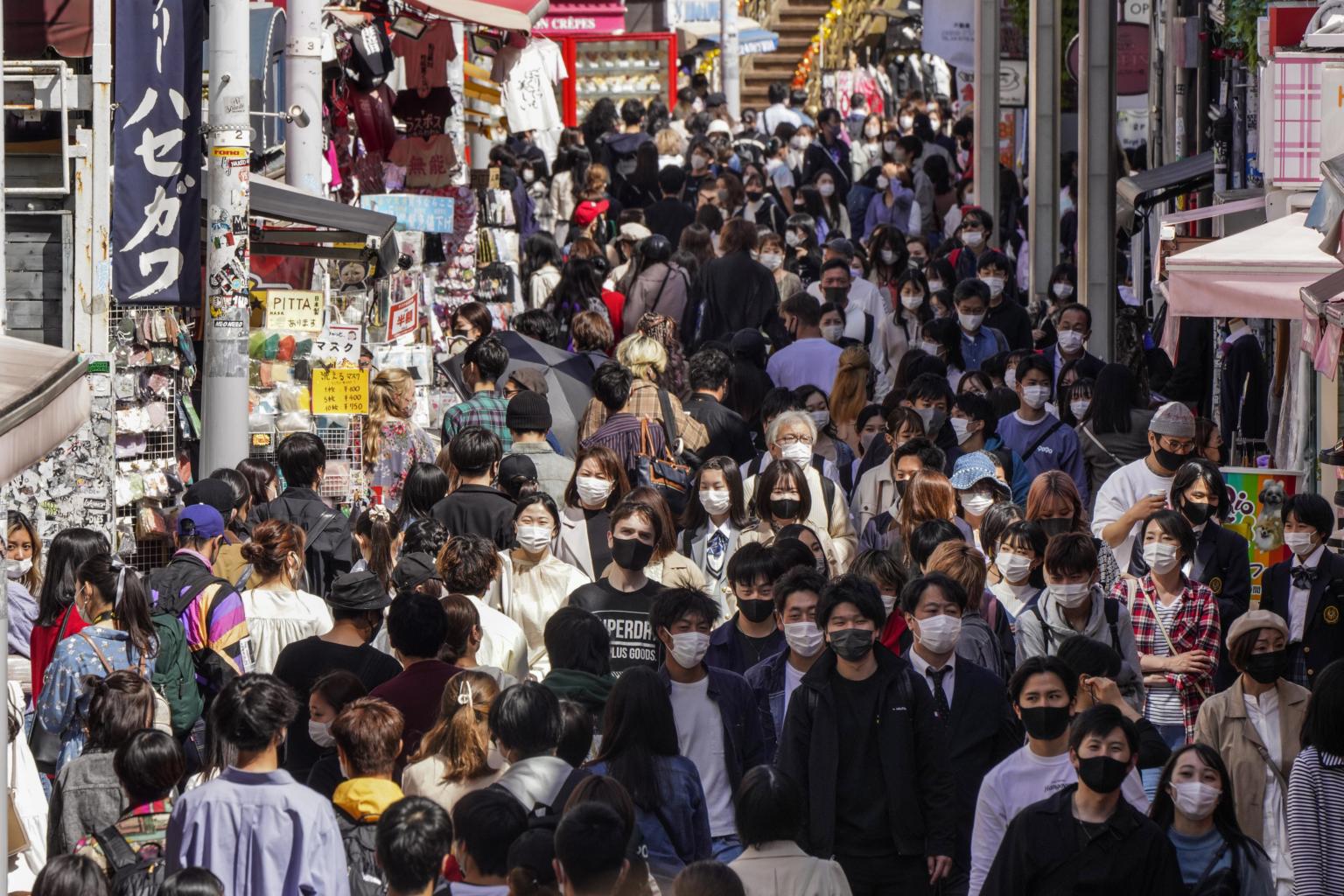People wearing protective masks swarm the Takeshita Street at Harajuku in Tokyo, on April 18, 2021.