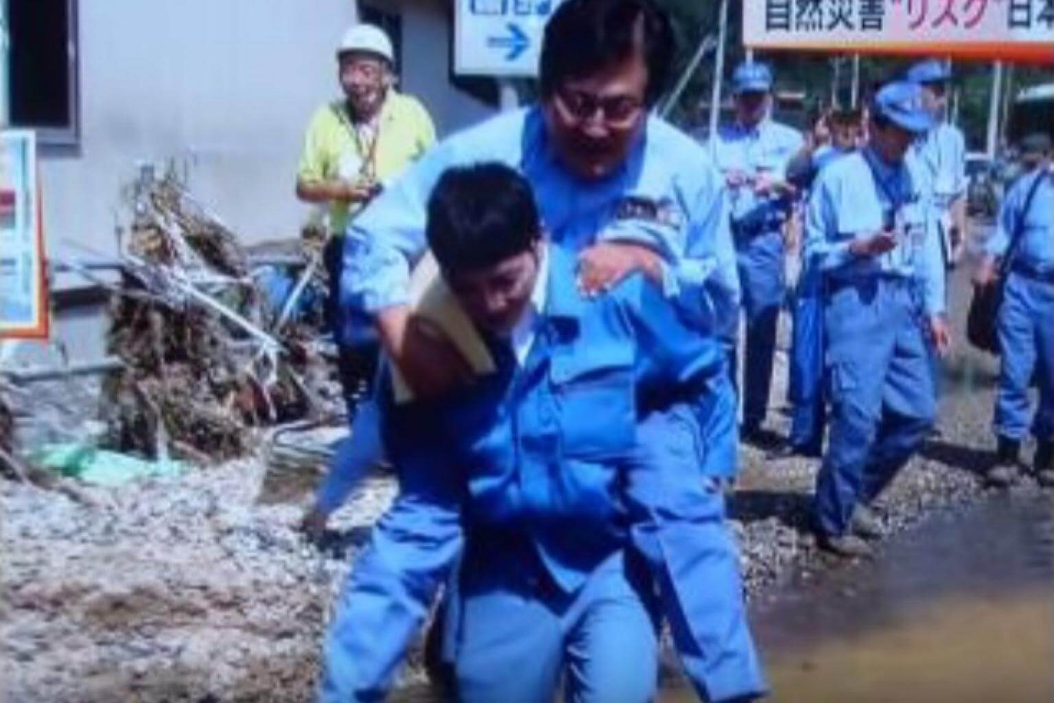 Japan official criticised for piggyback ride over puddle in typhoon-hit town