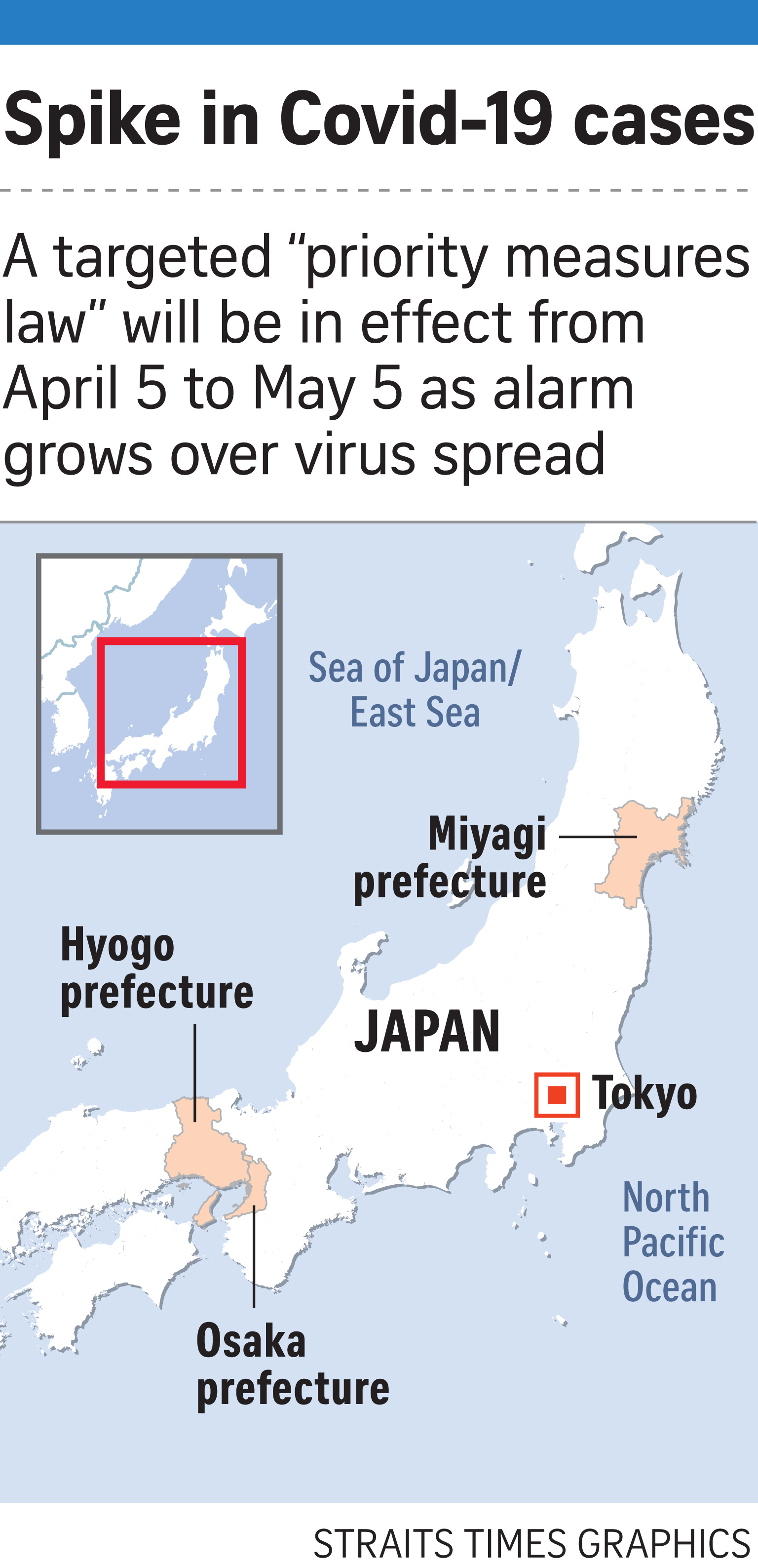 Prime Minister Yoshihide Suga on Thursday (April 1) used a new anti-virus "priority measures law" for the first time, covering parts of Osaka and Hyogo prefectures in western Japan and Miyagi prefecture in the north-east.