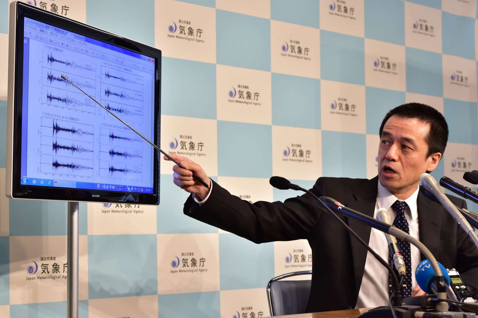 Japan's meteorological agency officer Yohei Hasegawa displays a chart showing seismic activity after North Korea's nuclear test.