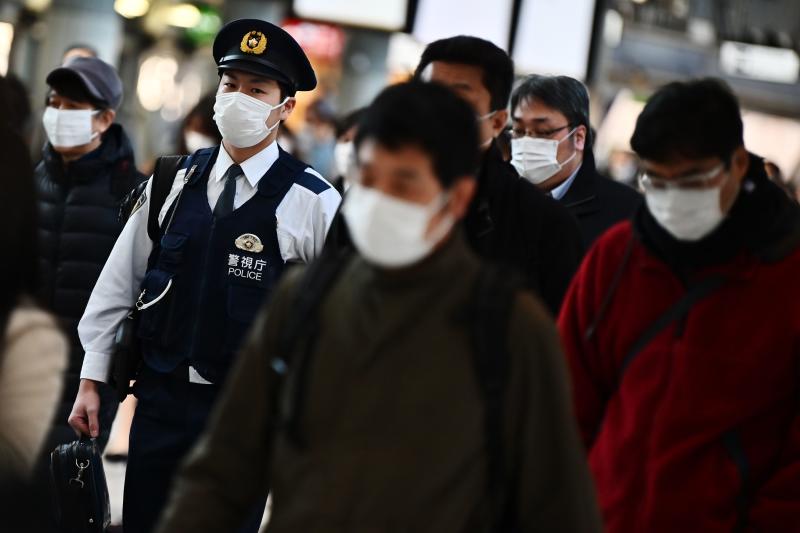 A photo taken on Feb 28, 2020 shows mask-clad commuters make their way to work at Shinagawa train station in Tokyo.