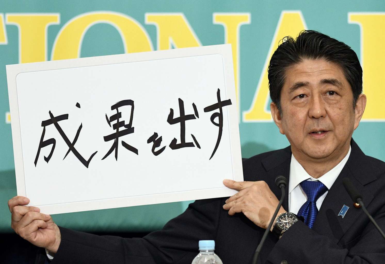 Japanese Prime Minister Shinzo Abe shows a placard reading "Produce Results" at a party leaders' debate in Tokyo, on June 21, 2016.