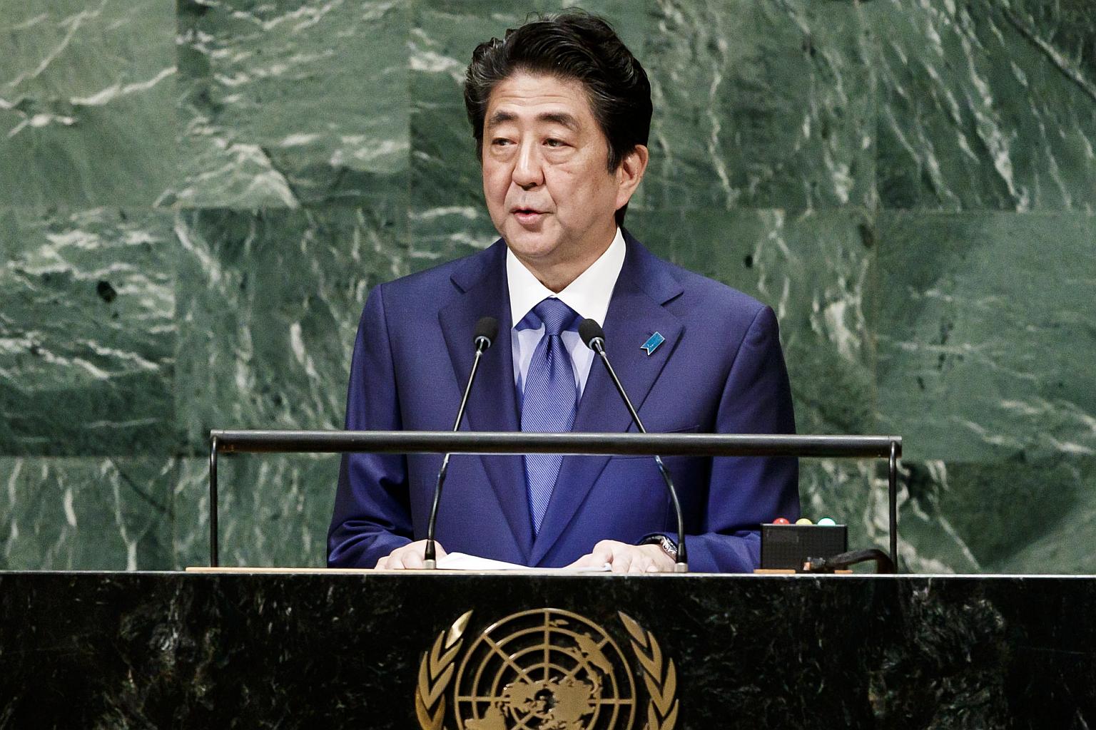 Japan Prime Minister Shinzo Abe addressing the UN General Assembly at the UN headquarters in New York, on Sept 25, 2018.