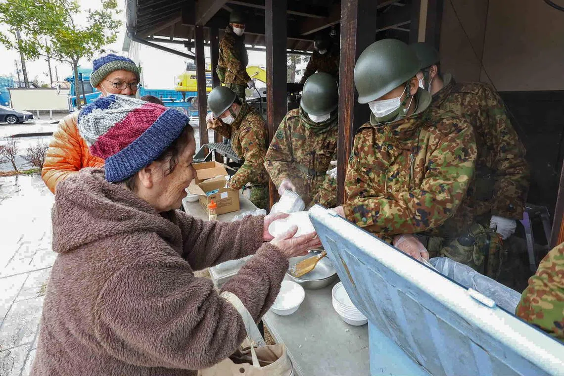 A woman receives food from Japanese Self-Defence Force personnel in Suzu city, Ishikawa prefecture, on Jan 7.