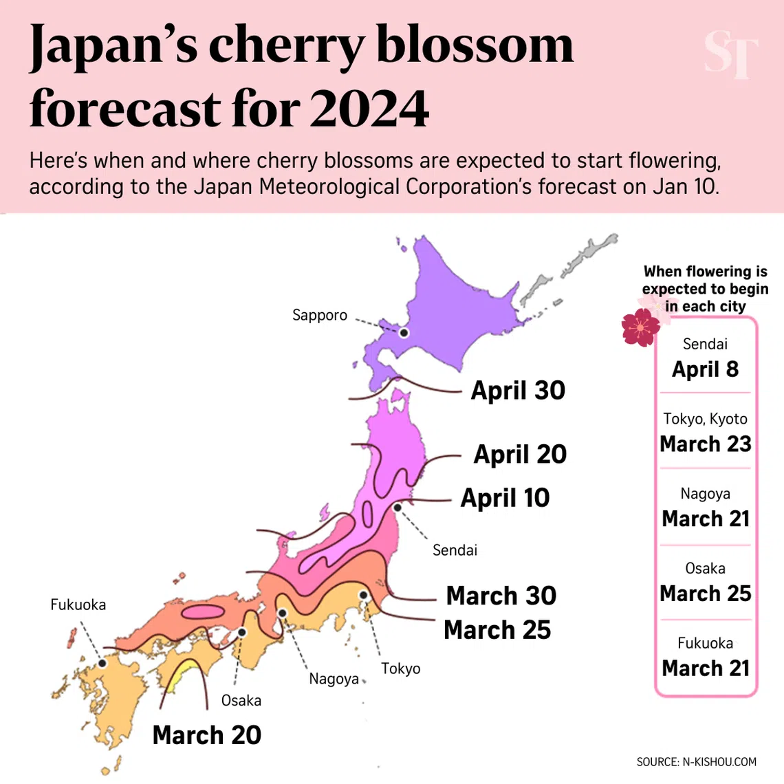 Japan on Jan 10 released its first forecast of the dates when cherry blossoms will start flowering and blooming in 2024.