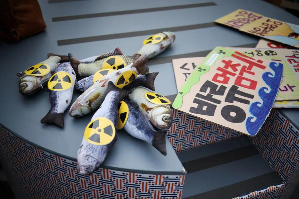 Fish-like dolls bearing radiation warning signs are pictured during a protest against Japan’s plan to release treated wastewater on Aug 24, 2023.