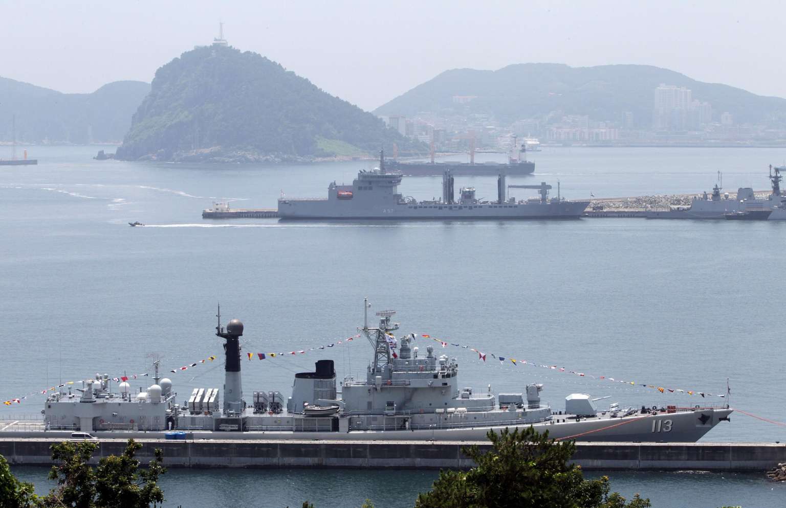 Visiting Chinese destroyer the Qingdao (front) and Indian naval tanker Shakti (back) dock at the dock of the Naval Operational Command in the city of Busan, South Korea.