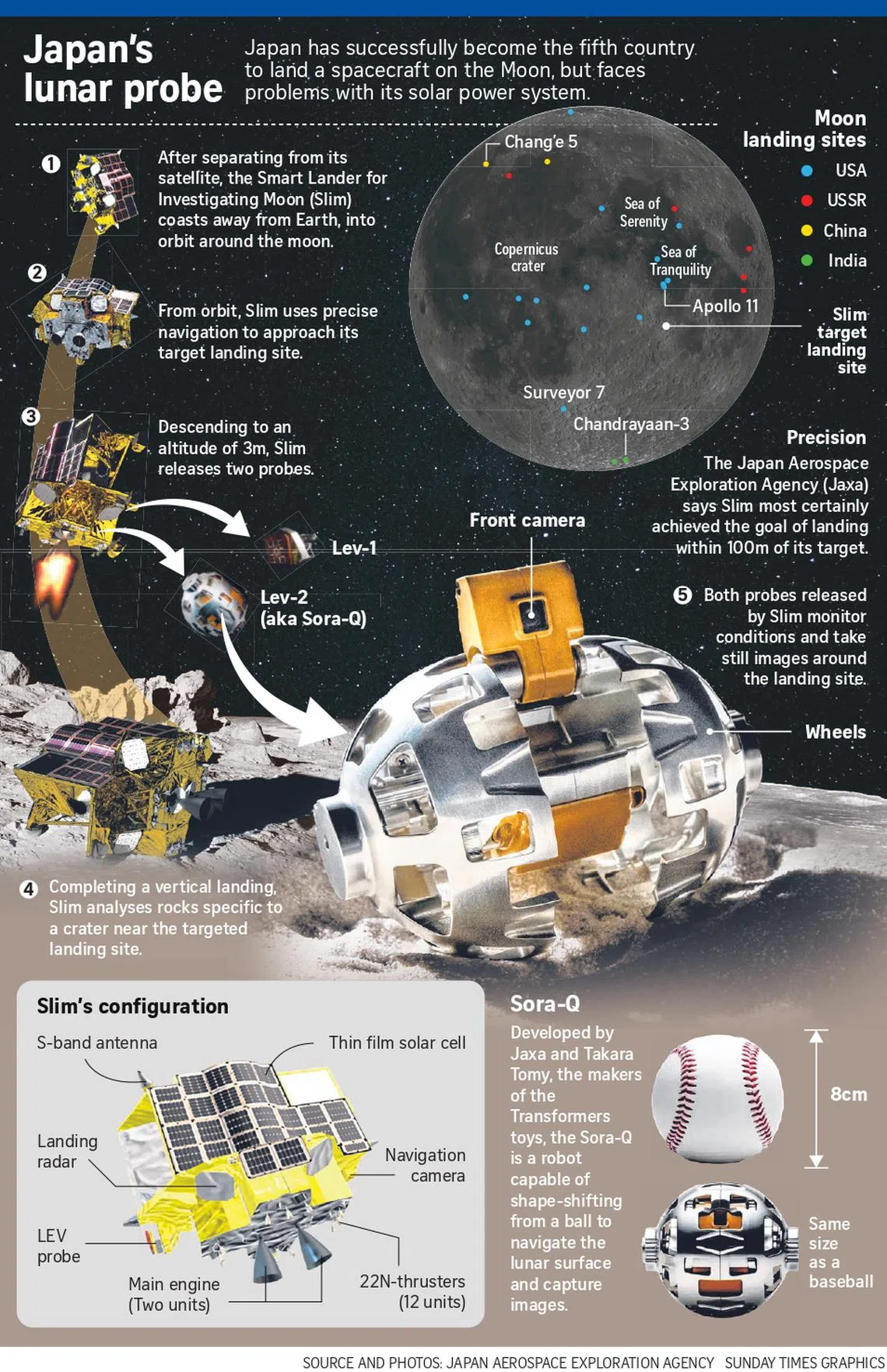 With its unmanned Smart Lander for Investigating Moon (Slim) mission – dubbed Moon Sniper for the craft’s precision landing capabilities – Japan became the fifth country to achieve a soft lunar landing.