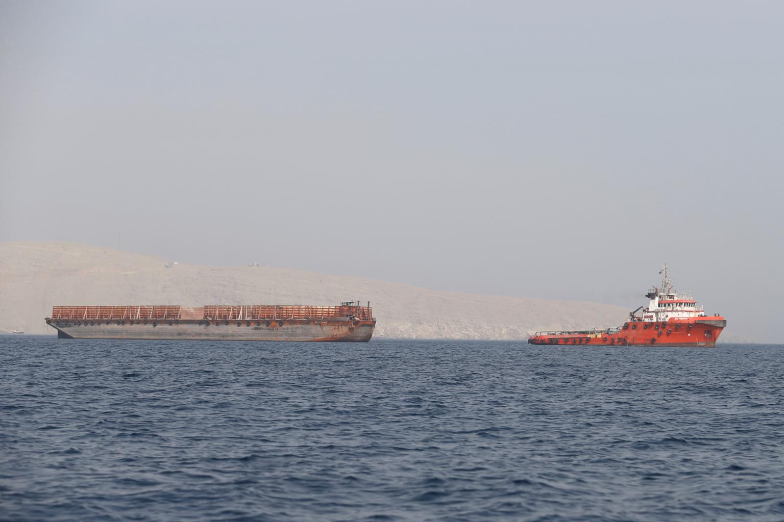 A tugboat moves cargo towards the Strait of Hormuz off the coast of Musandam province, Oman, on July 20, 2018.
