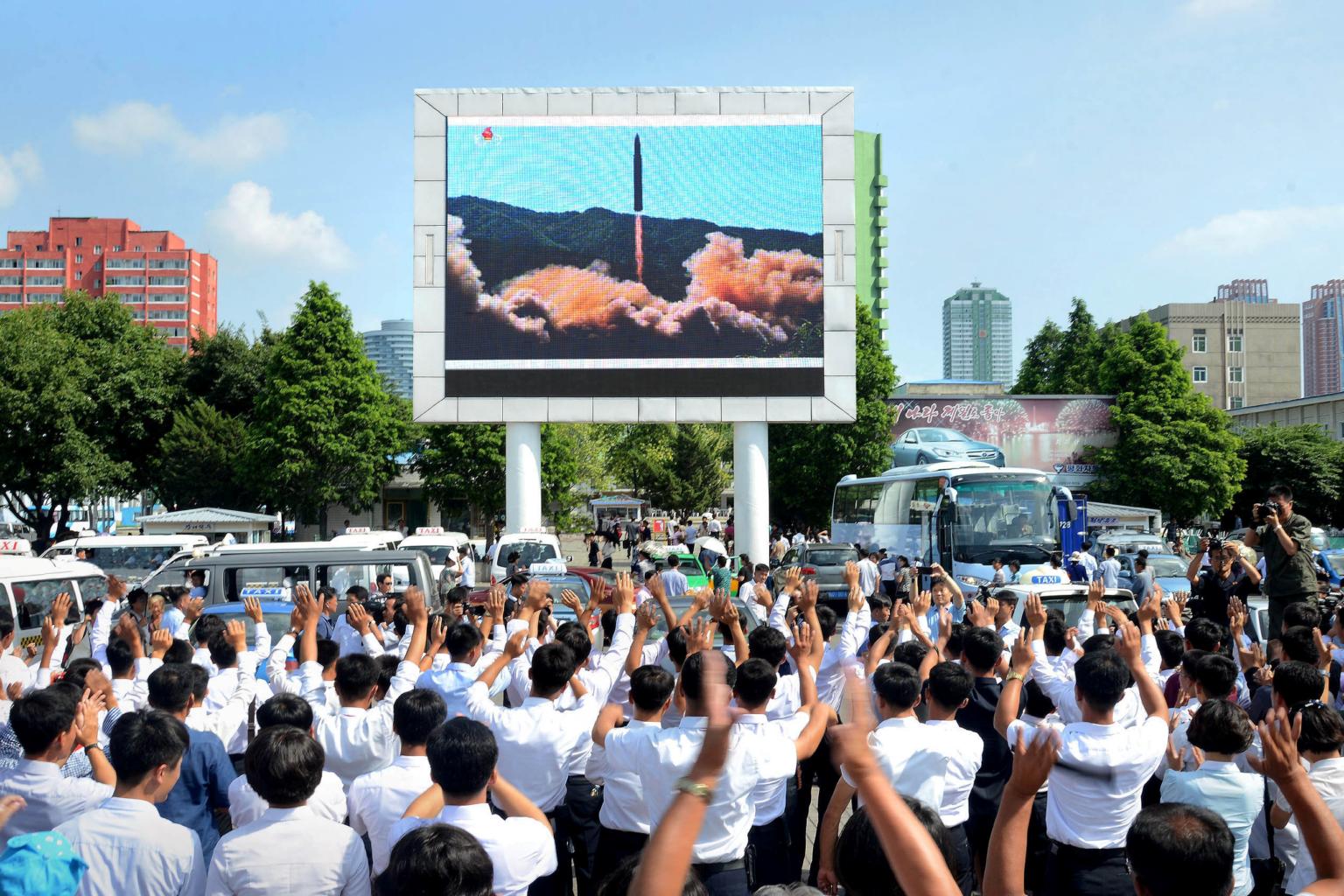 People watch a huge screen showing the test launch of intercontinental ballistic missile Hwasong-14 in this undated photo released by North Korea's Korean Central News Agency (KCNA).