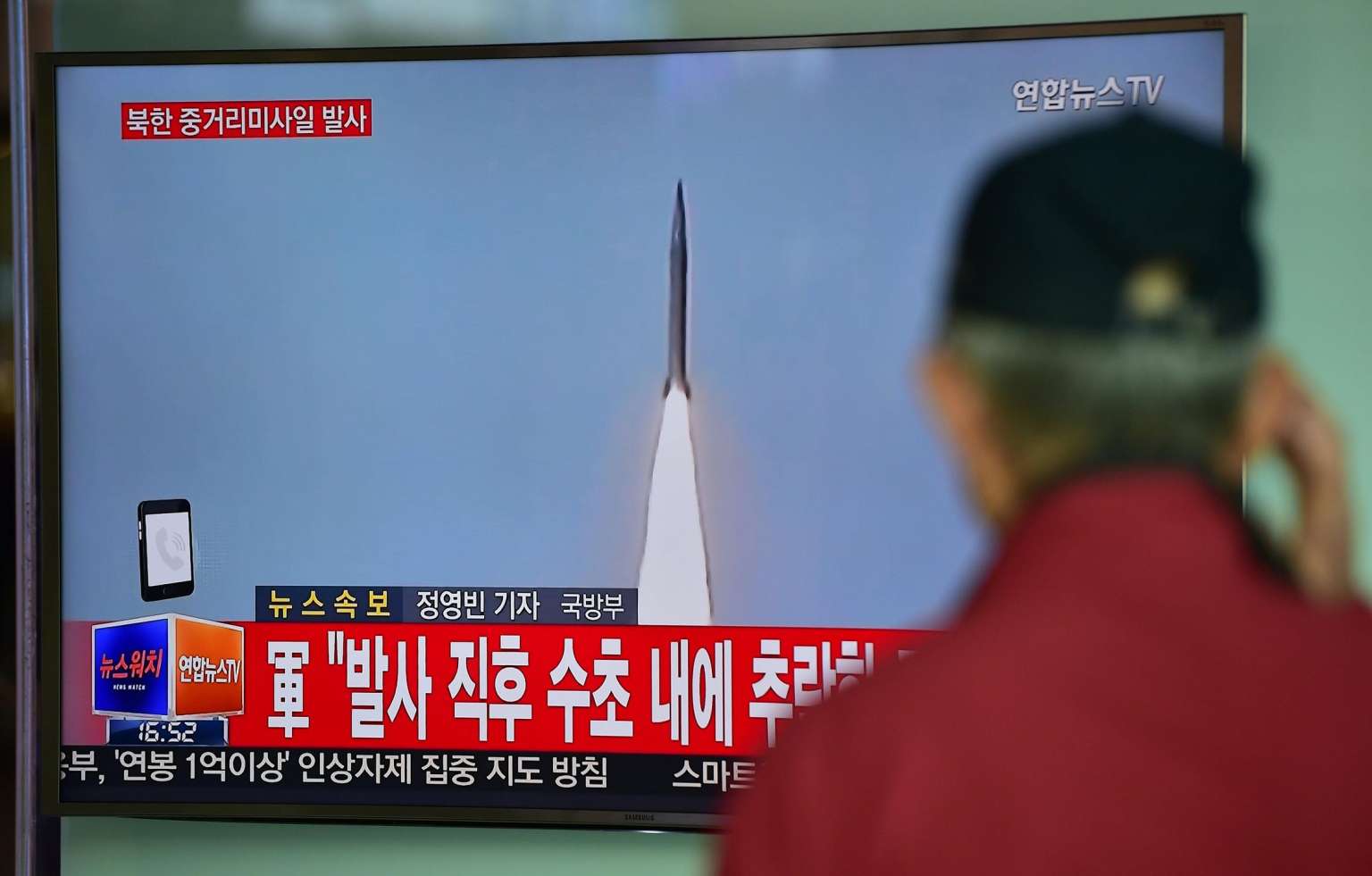 A man watches a TV news showing file footage of a North Korean missile launch at a railway station in Seoul, on April 28, 2016.