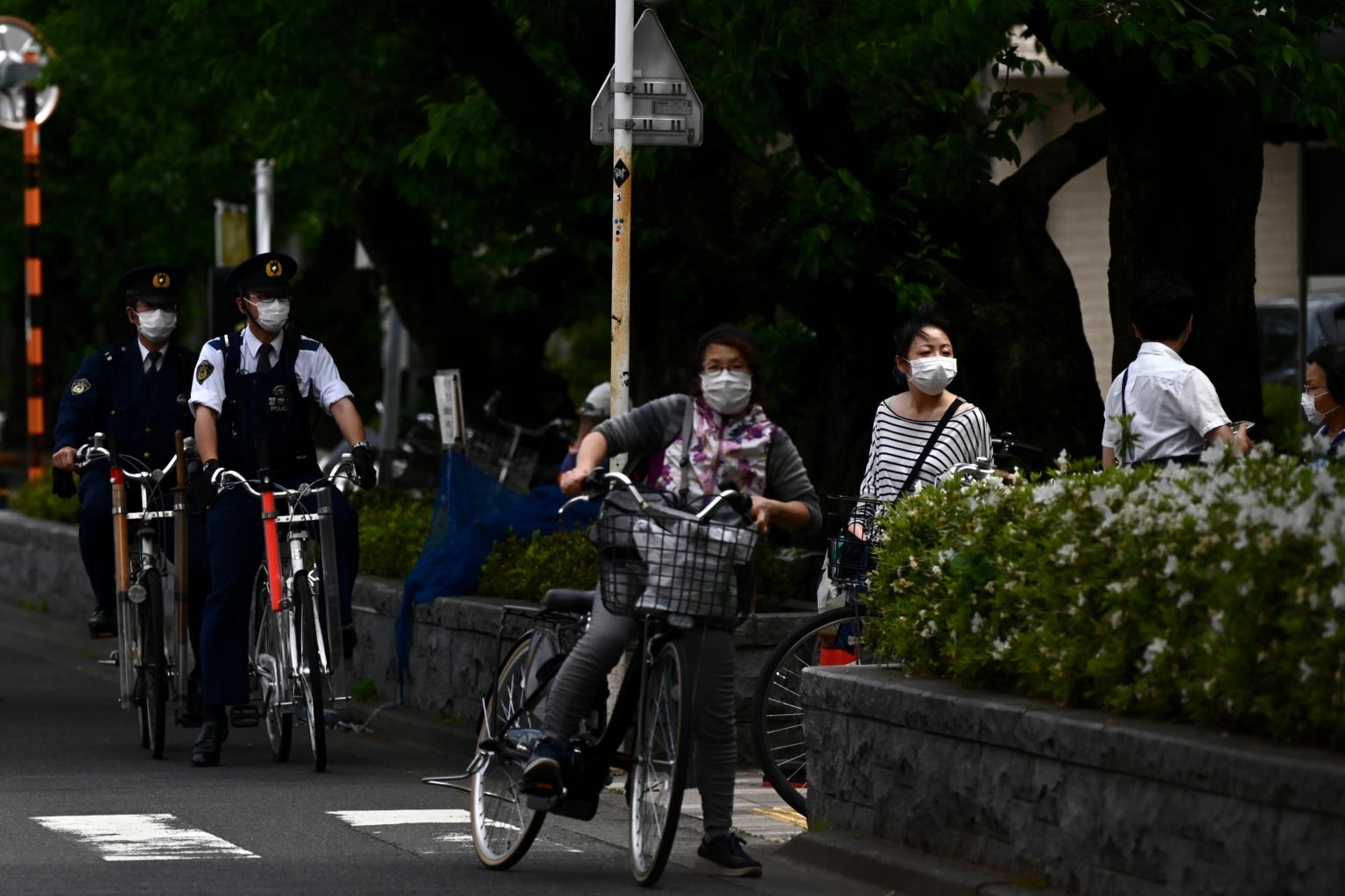 Policemen wearing face masks patrol in a street of Tokyo on May 3, 2020.