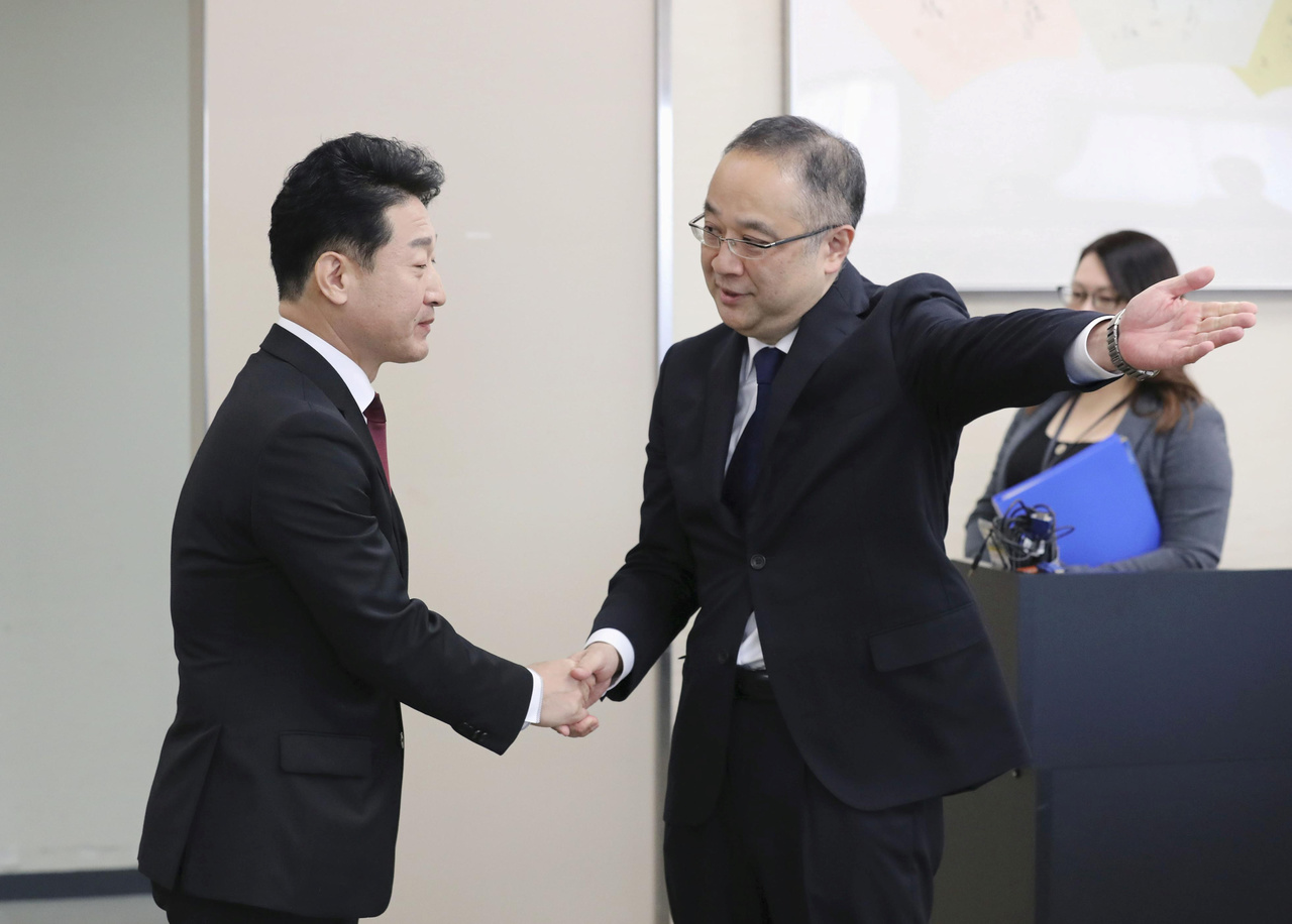 South Korea's Director General For International Trade Policy Lee Ho-hyeon (left) and Japan's Director General for Trade Control Department Yoichi Iida shake hands in Tokyo on Dec 16, 2019.
