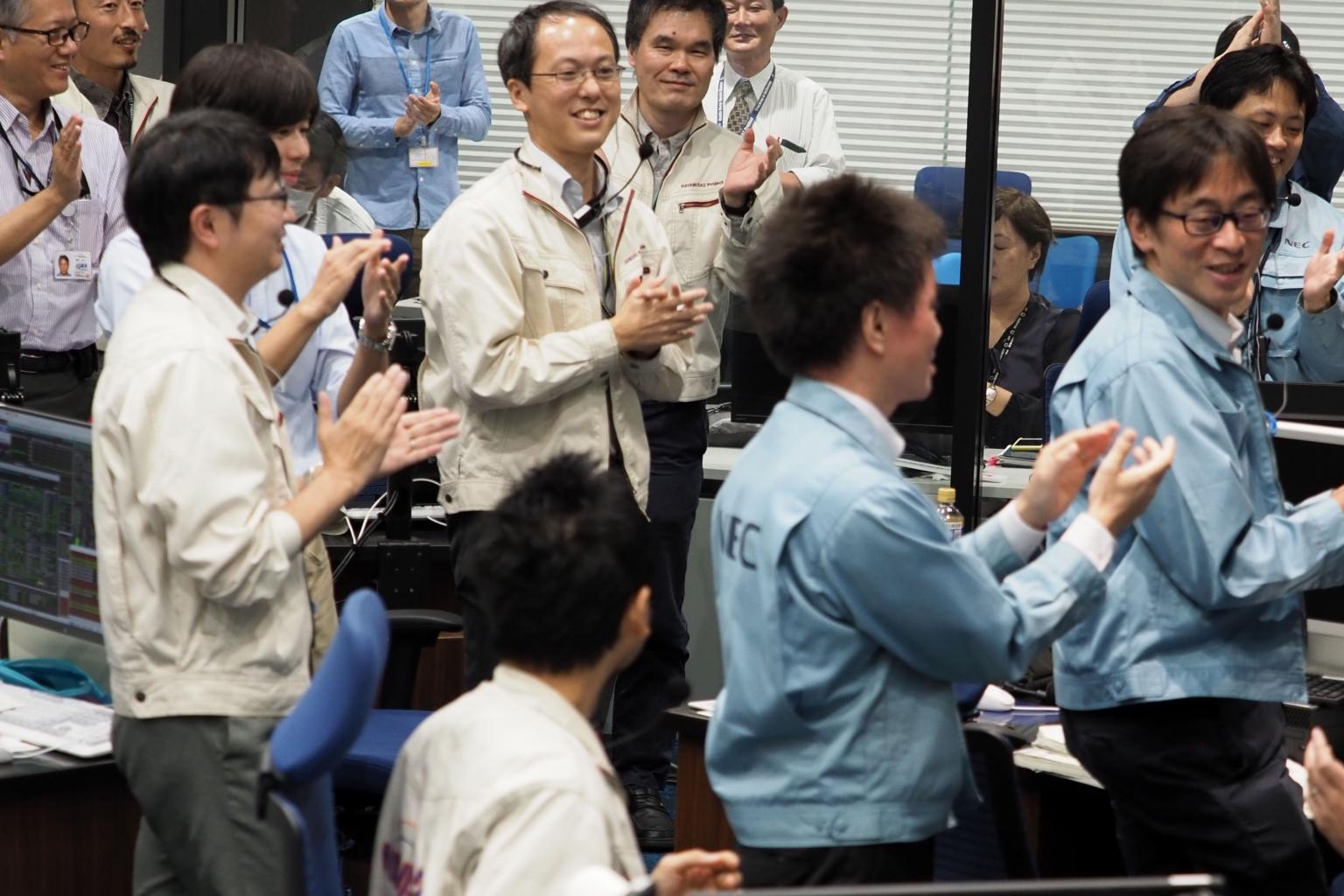 Researchers applaud at a control room in Sagamihara, Kanagawa prefecture, during the French-German Mobile Asteroid Surface Scout deployment operation.