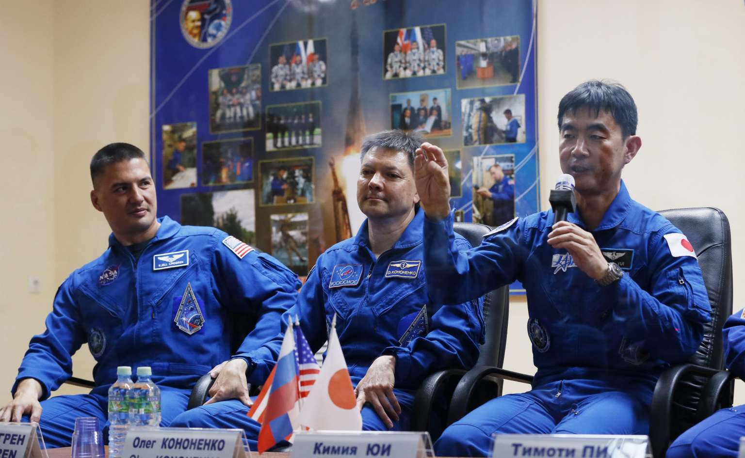 Russian Cosmonaut Oleg Kononenko (center), JAXA astronaut Kimiya Yui and NASA astronaut Kjell Norwood Lindgren (left) attend a press conference at the Baikonur Cosmodrome, Kazakhstan on July 21, 2015.