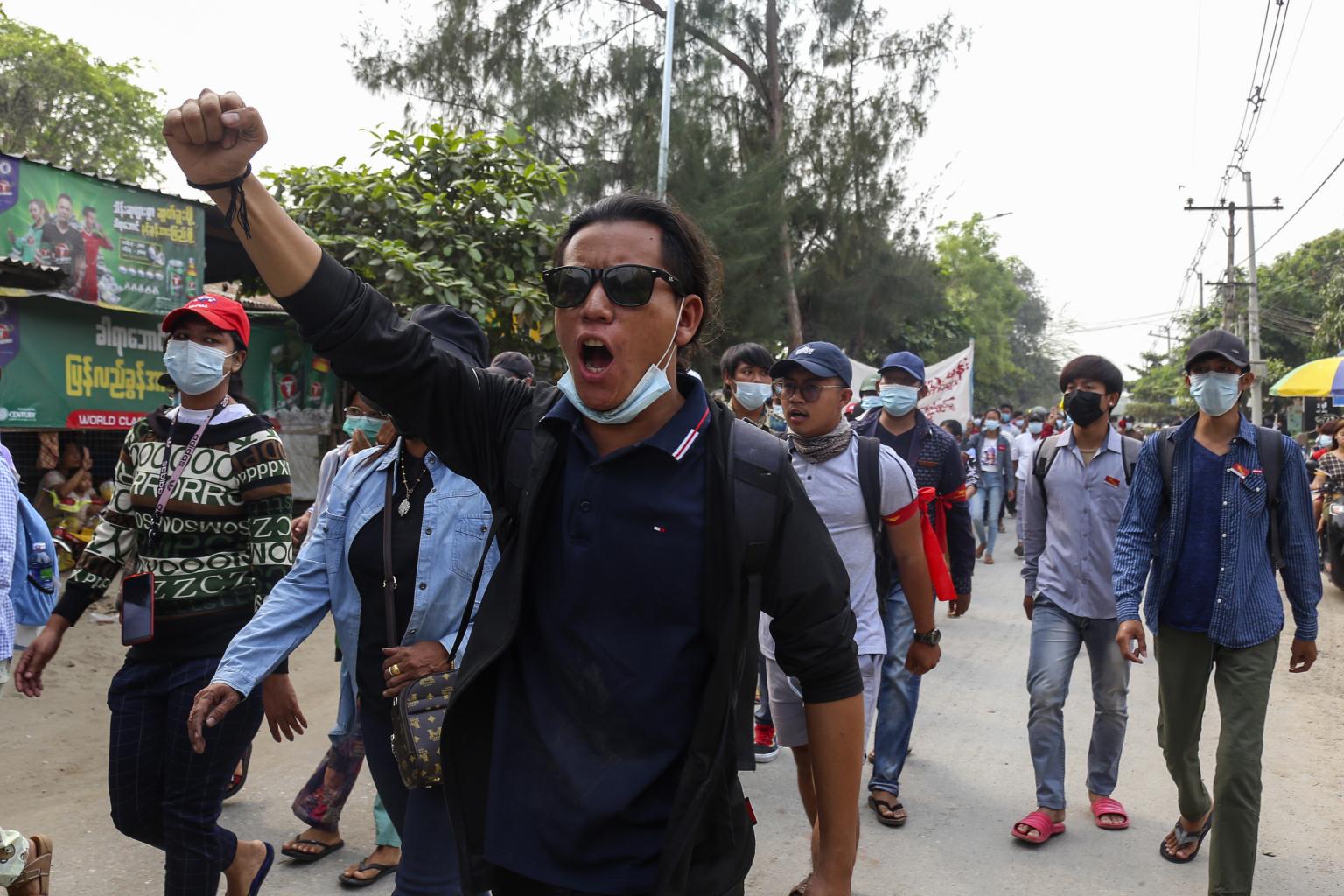 Demonstrators march during a protest against the military coup in Mandalay, on March 31, 2021.