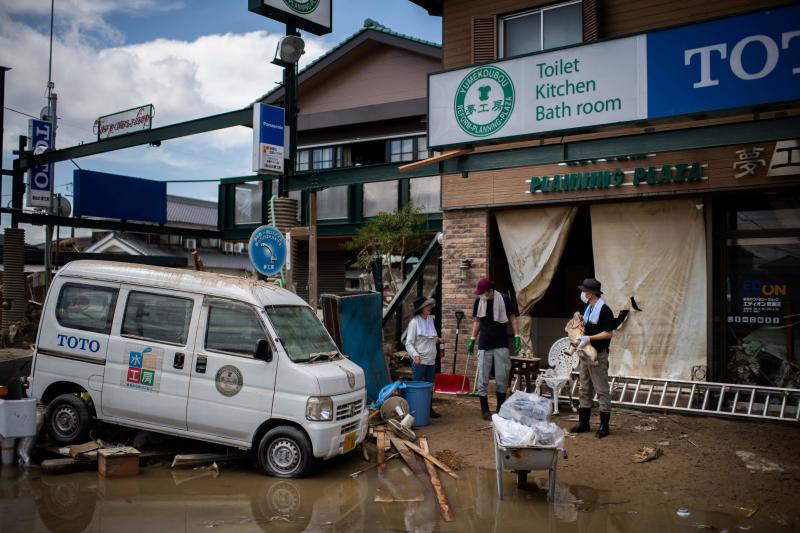 People cleaning up the damage in a flood-hit area in Mabi, Okayama prefecture, on July 10, 2018.