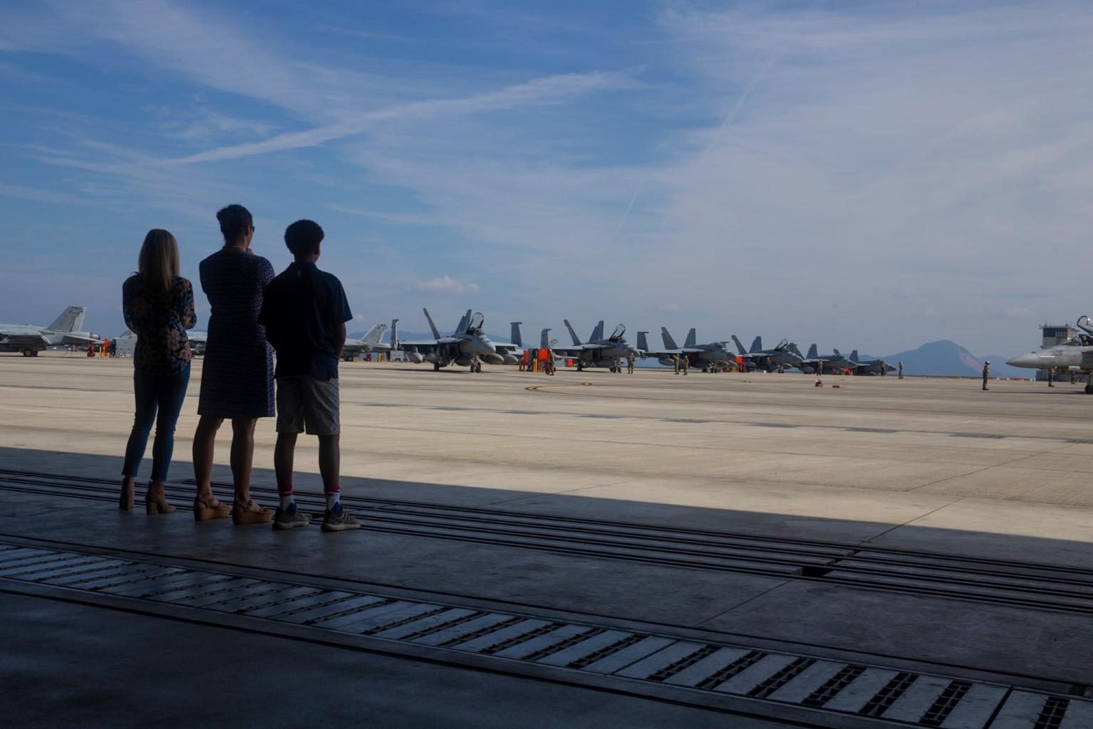 Family members of pilots waiting at Marine Corps Air Station Iwakuni. Japan has agreed to buy Mageshima Island, off its south-west coast, for US fighter jets from Iwakuni to train.